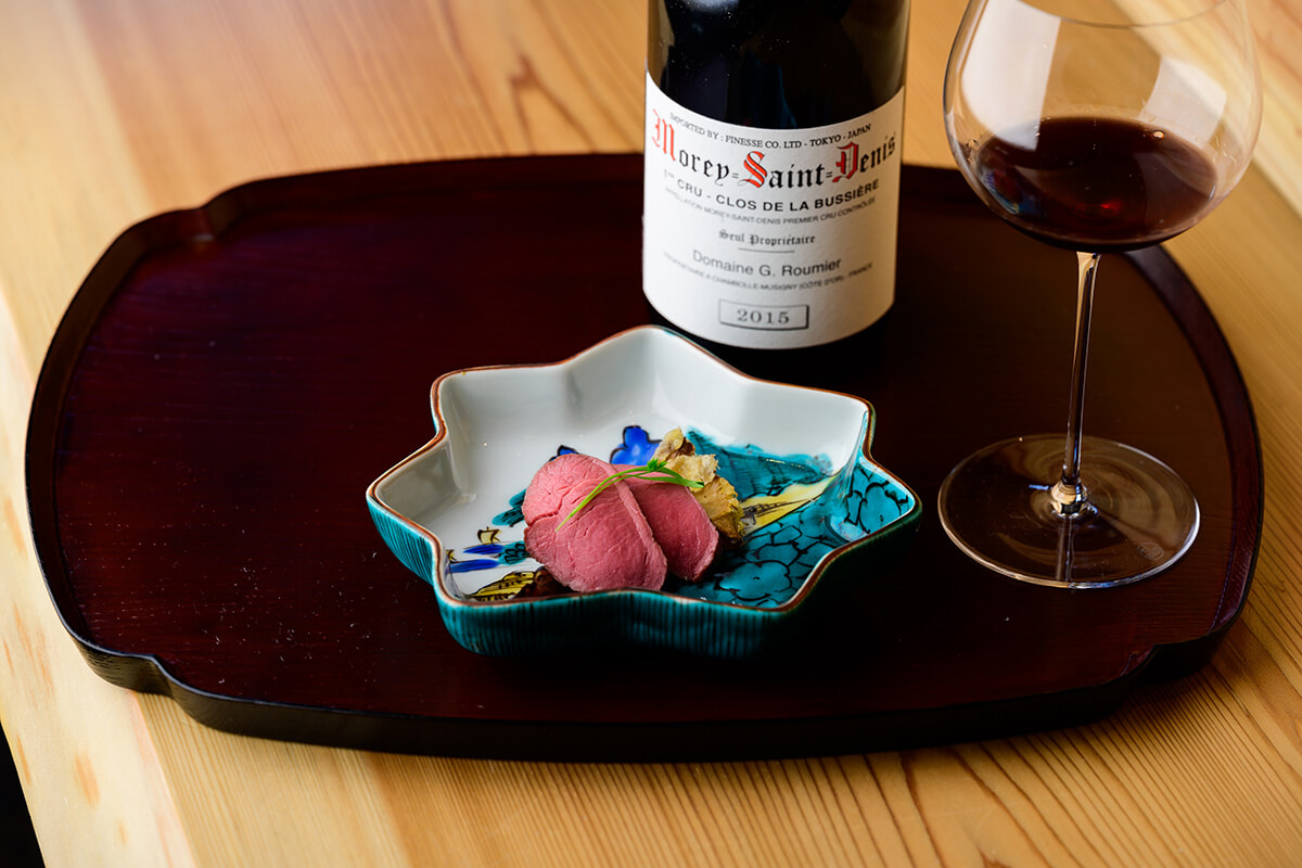繊細な火入れで低温調理した本州鹿の薄造り、天然舞茸添え。有機栽培のワラで燻し、能登の塩で。うつわは九谷の角福。ワインは「ルイ ジャド モレサン ドニ」(ボトルのみ)ほかクラシック系をラインナップ。通常のグラス提供のワインは¥1,400〜