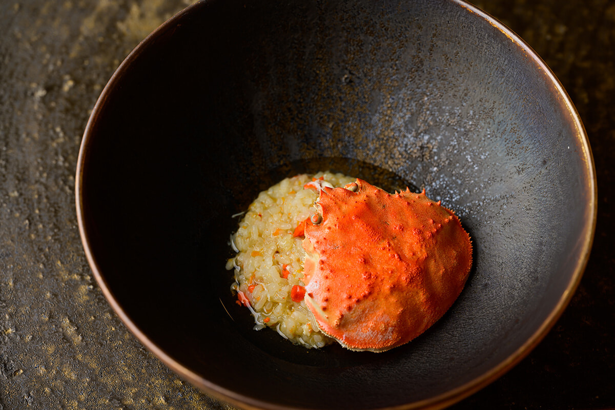 冬の風物詩であるズワイガニの雌、香箱ガニから。ズワイガニは深海に生息しており、通常漁場は遠海。けれど石川県沿岸はすぐに深海となるズワイガニの生息に適した漁場が点在する。石川県では雌を香箱ガニ、雄は加能ガニと呼び、自然保護のため漁期限定で提供している。香箱ガニは毎年11月6日から12月末、加能ガニは翌年3月20日まで。特に金沢おでんの具材”かに面”で知られる香箱ガニは、手のひらサイズで脚の身は少ないものの外子、内子と合わせた濃厚な味わいとプチプチした食感が魅力。今回は、シェフの感性でさらにアレンジされた、魅惑の香箱ガニ料理をピックアップ。