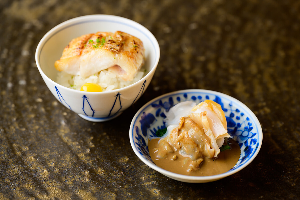 のど黒の飯蒸し(左、¥3,300)とバイ貝の肝がけ(右、¥1,100)。少量多種でいただけるのがうれしい。