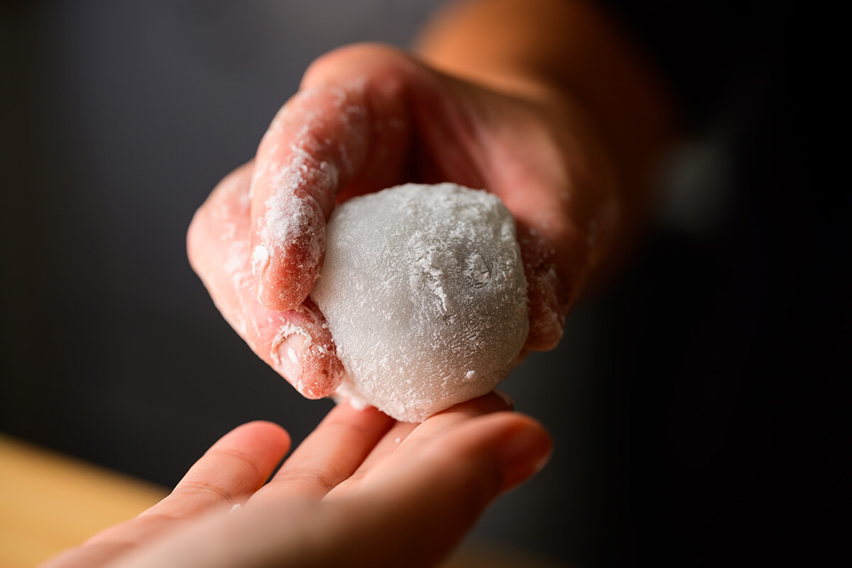 目の前で仕上げられた大福(¥770)を手渡しで。イチゴのほか、季節のフルーツ入り。