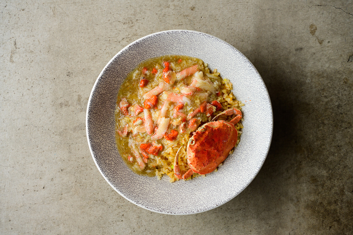 「香箱蟹あんかけ炒飯」(¥2,420)はパラパラの炒飯に、一杯のカニを丸ごと使用し、ショウガを効かせた塩味のあんをたっぷり添えた贅沢な一品。