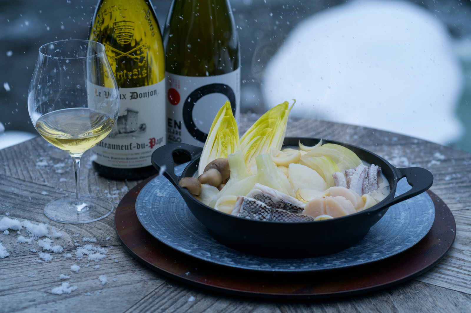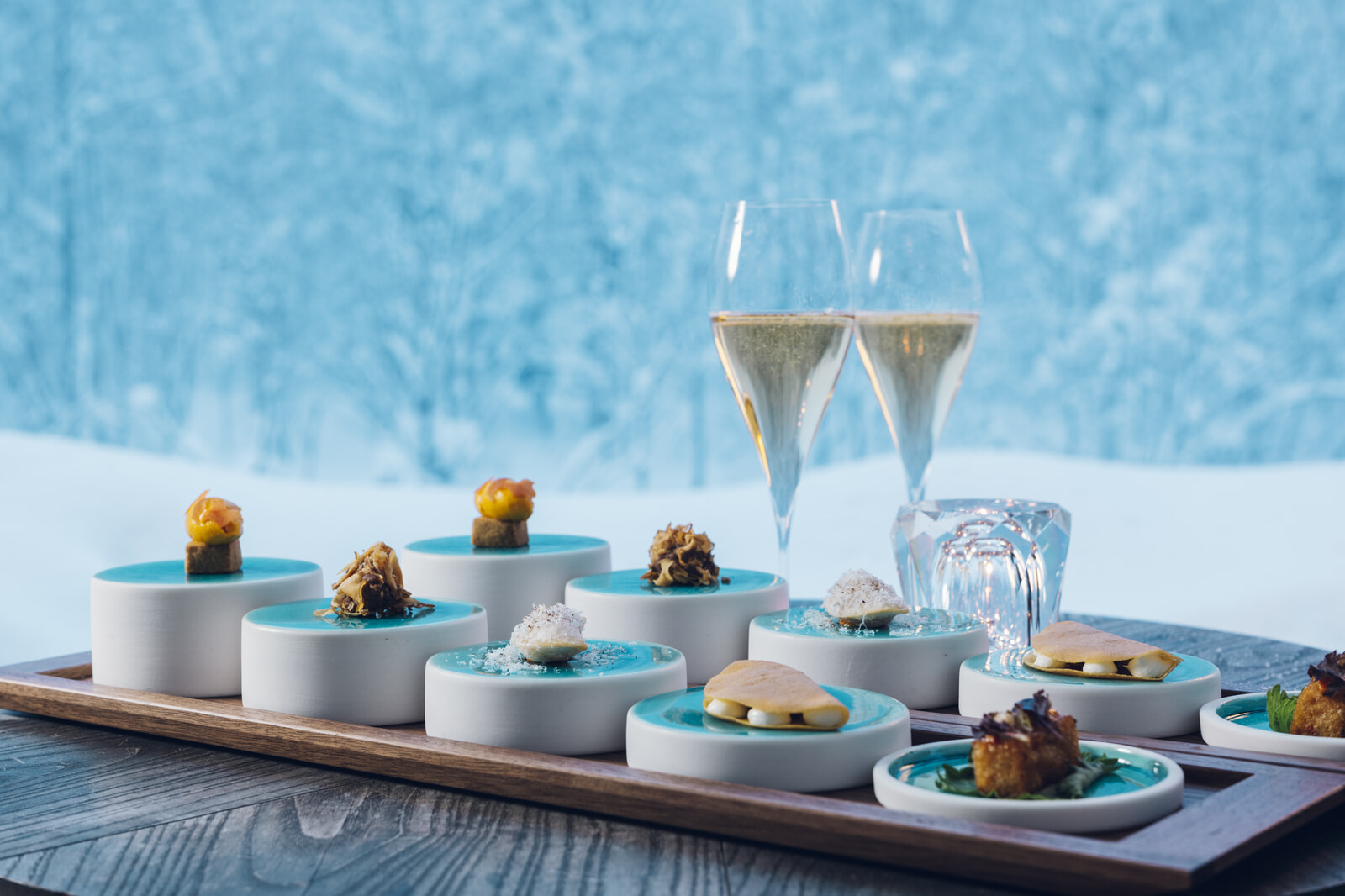 夕食は、まず渓流沿いに用意されたパラソルの開いたテーブルで、瀬音を聞きながら「渓流アペロ」に始まりました。夕焼けが徐々に終わり宵闇が迫ると、その後レストラン内に席を移動し、青森らしい旬の食材で造られるフレンチを堪能します。150種、約2000本が用意されているというワインとともに、ワインのマリアージュを楽しむのも贅沢なひと時です。