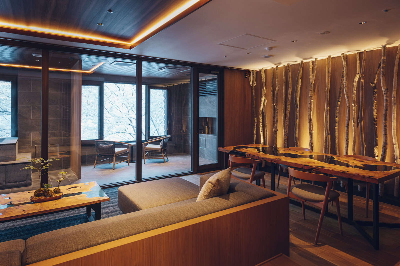「渓流スイート」(120㎡)のリビング&ダイニングスペース。渓流が見晴らせる客室温泉、本物の苔を用いた壁画などラグジュアリーな客室。