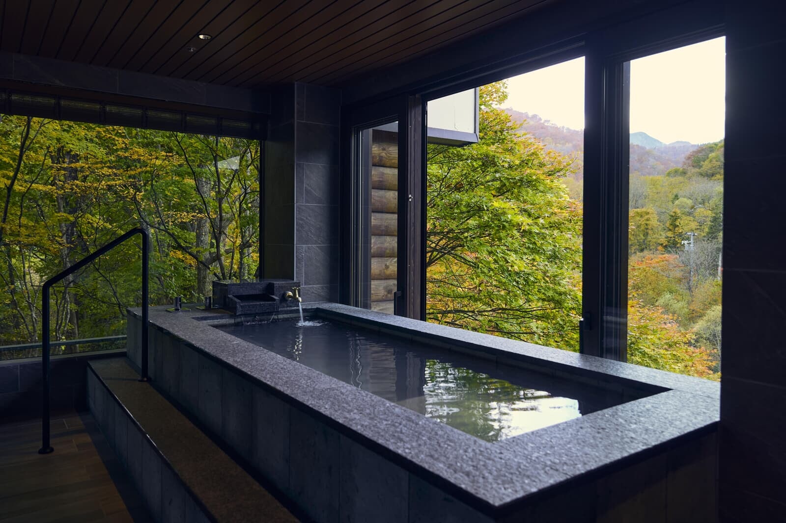 「渓流スイートルーム」の客室温泉。大きなガラス窓からは周囲の自然が映り込み四季を感じながら温泉三昧。