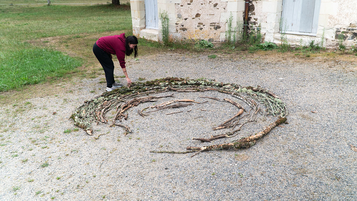 「木の枝や葉など、各自が見つけたものを素材に、あらかじめ計画した表現に沿って制作を進めるという過程もありますが、そのものとの対話から発生するようにもたらされる表現、それらに導かれるように進める制作の過程もあります。双方のバランスが大切です」