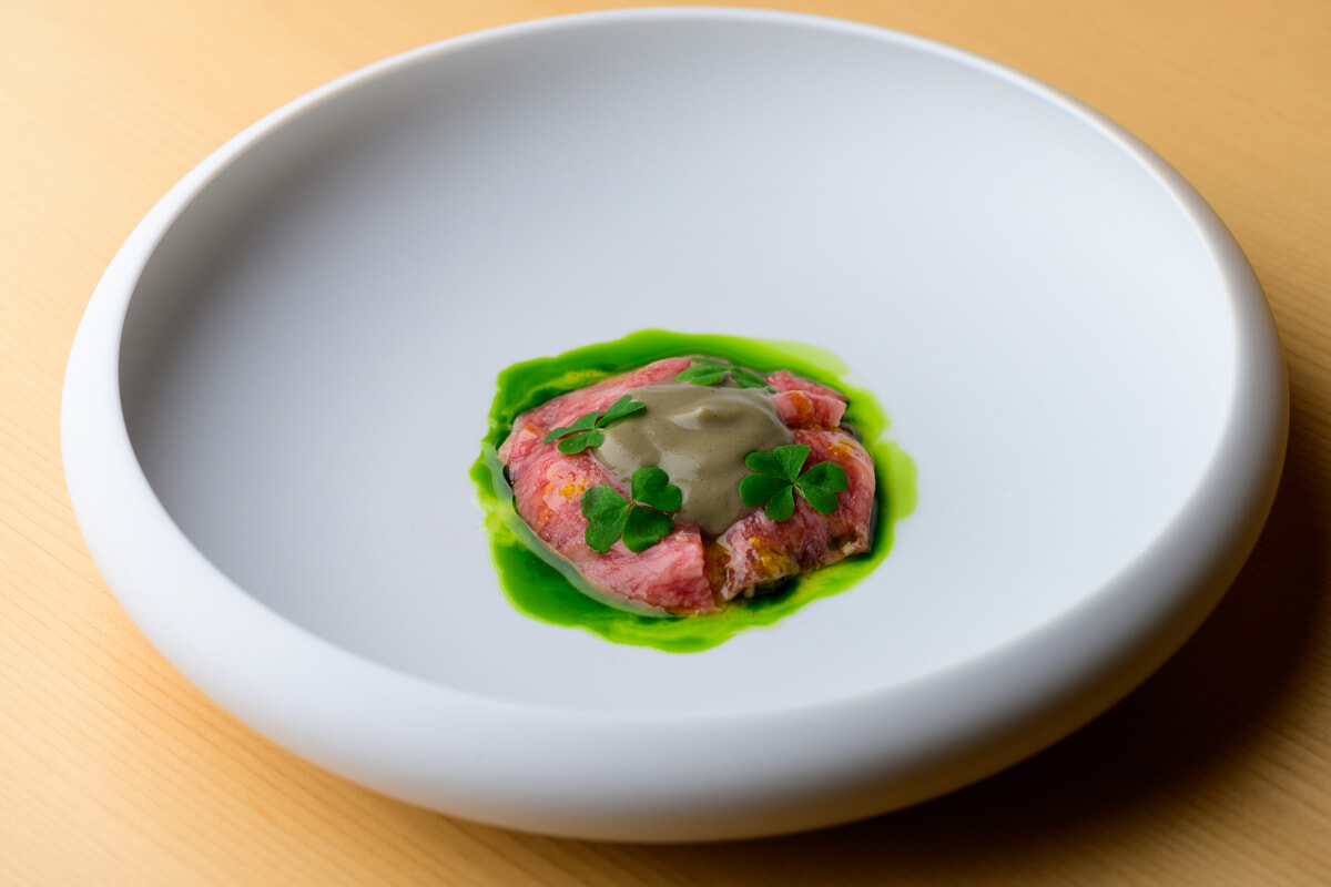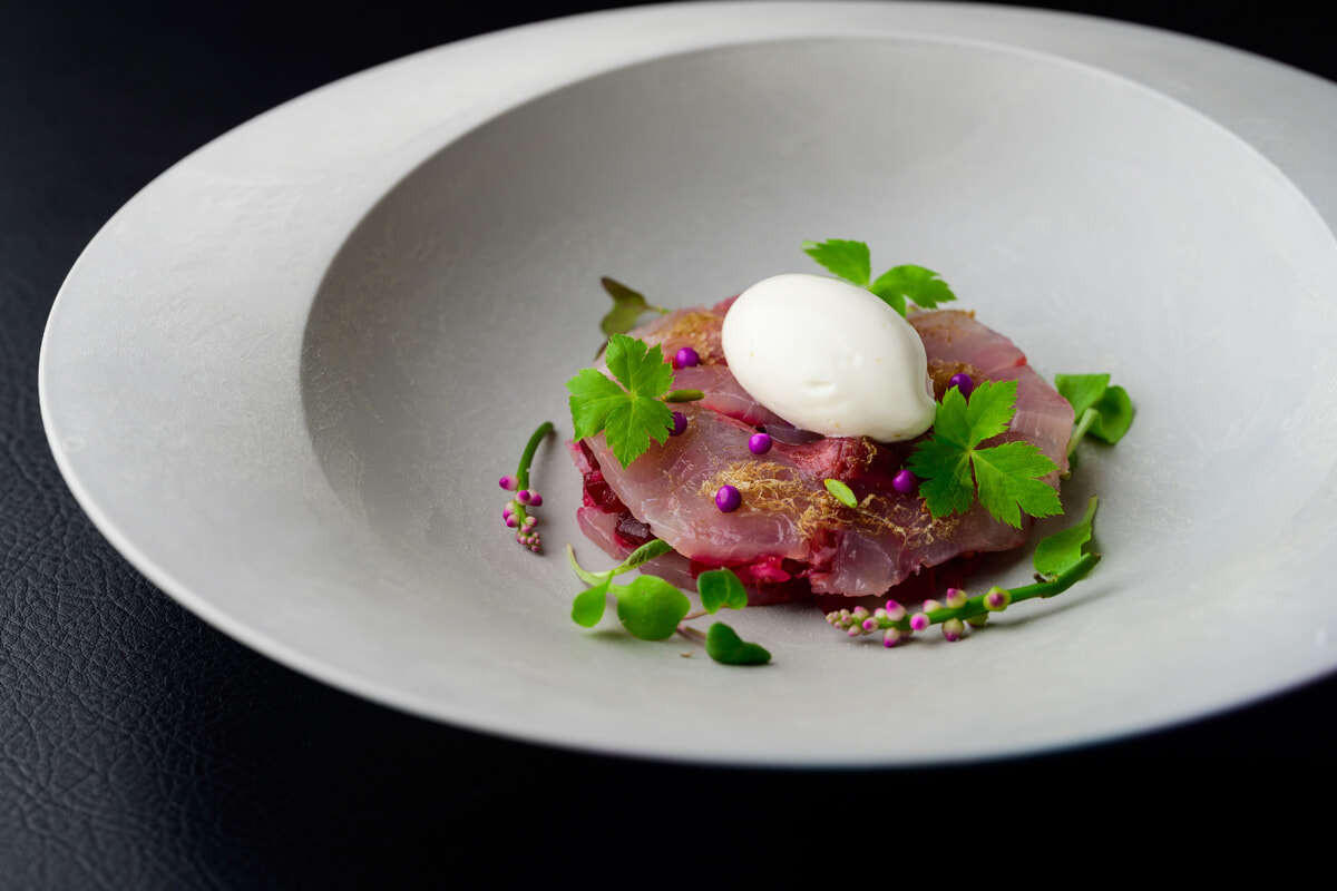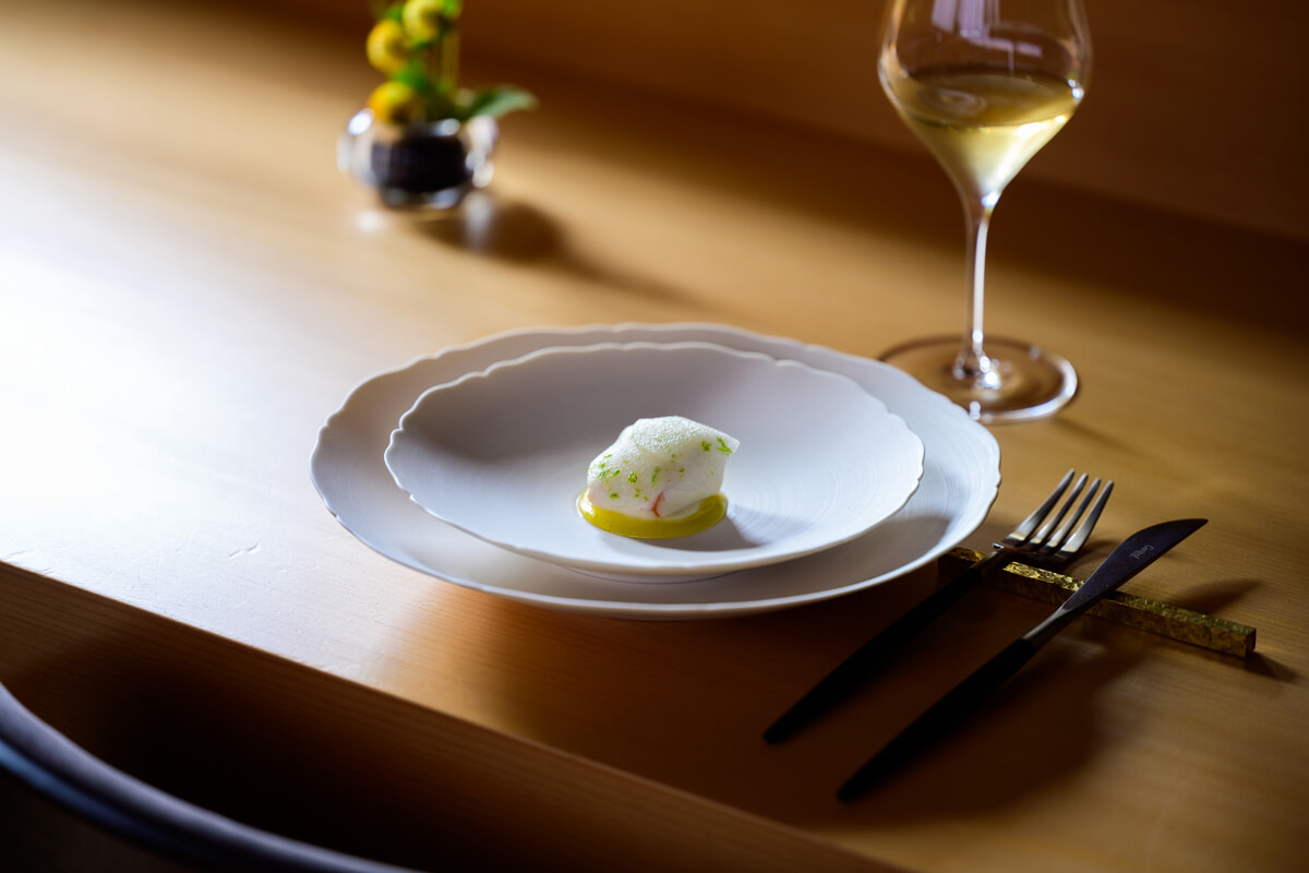料理人の家に育ち、東京のミシュラン2つ星フレンチや懐石料理店で修業した河野大介。「東京で競争するよりも」と移住し、2024年8月に自身の店をプレオープンした。フレンチと日本料理を折衷したイノベーティブフュージョンで少量多皿のコースは19品ほど。3時間近くとなるが油脂を極力抑え、食材の旨味を引き出したソースでいただく味わいは発見があり飽きさせない。土地や人との新たな繋がりで生まれた一皿からは、料理の喜びも伝わる。
