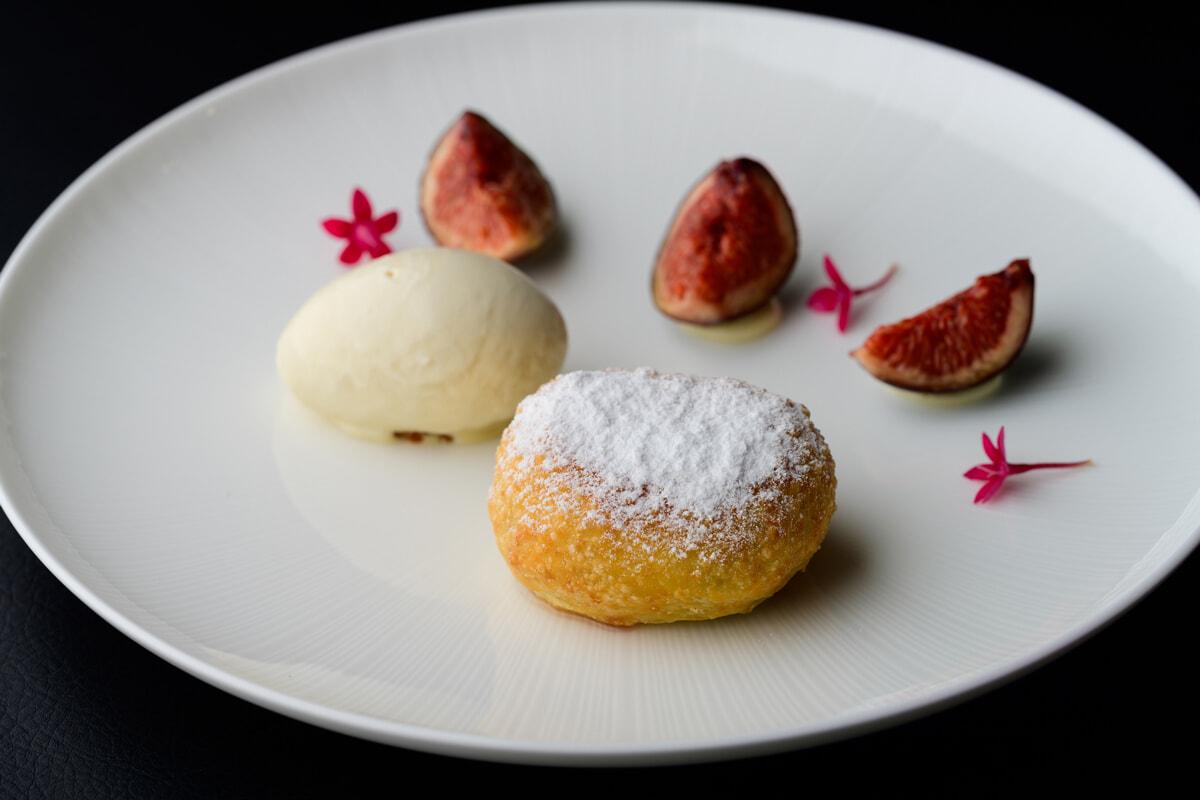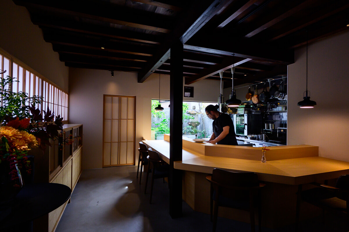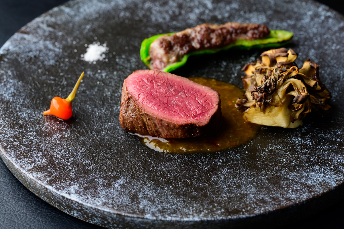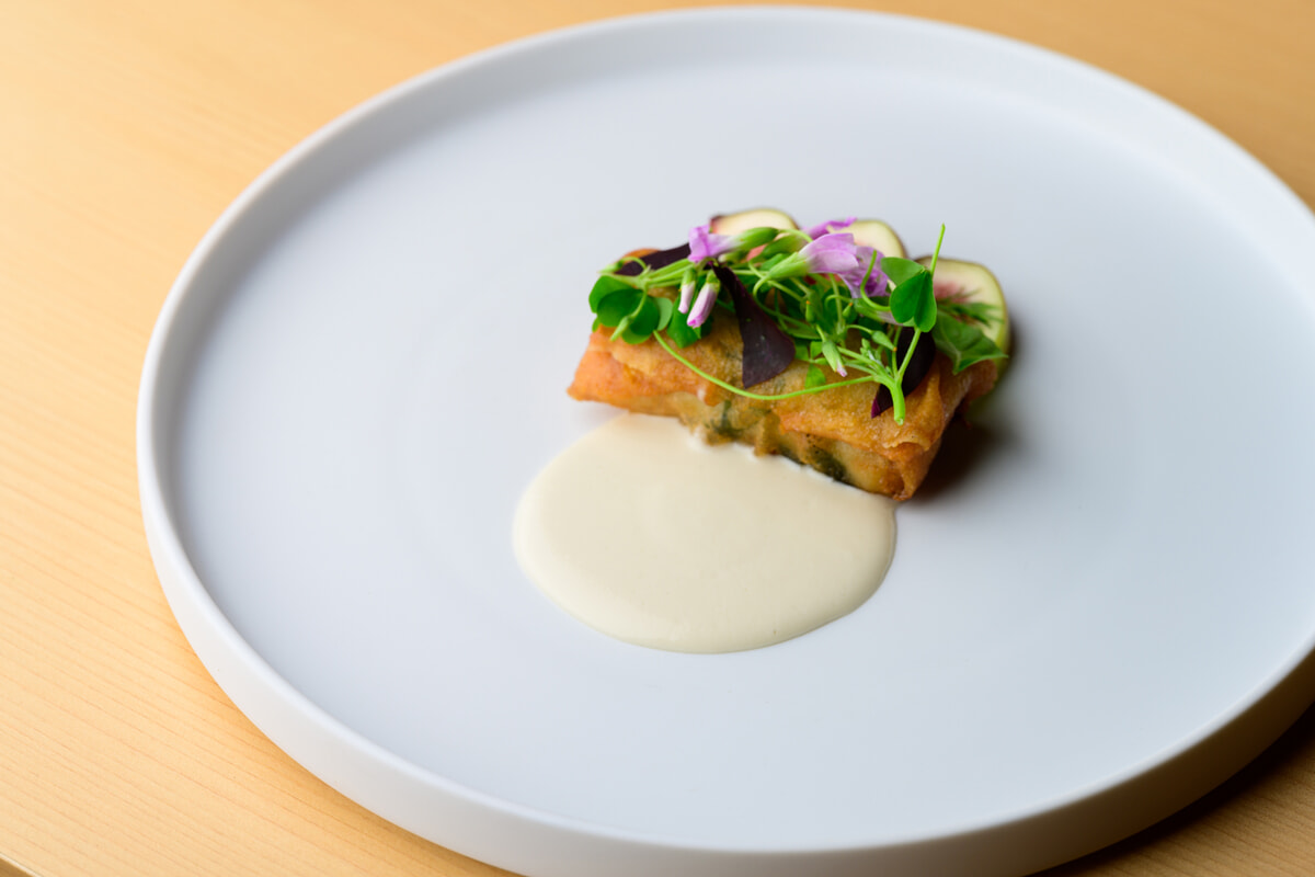 料理人の家に育ち、東京のミシュラン2つ星フレンチや懐石料理店で修業した河野大介。「東京で競争するよりも」と移住し、2024年8月に自身の店をプレオープンした。フレンチと日本料理を折衷したイノベーティブフュージョンで少量多皿のコースは19品ほど。3時間近くとなるが油脂を極力抑え、食材の旨味を引き出したソースでいただく味わいは発見があり飽きさせない。土地や人との新たな繋がりで生まれた一皿からは、料理の喜びも伝わる。