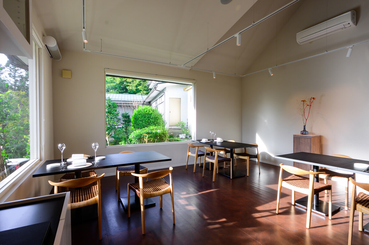 金沢の人気フレンチを経て、自身の店をオープンした満田浩シェフ。街なかでなく、あえて自然豊かな土地を選んだのは修業したブルゴーニュに似た雰囲気だったから。店名は仏語で「繋ぐ」の意。自然に寄り添い、北陸の食材や人を結ぶ場を目指している。新鮮な地元食材を主役にした料理は無農薬ハーブなども使い、香り豊かに。奥行きや華やかさがあり、フレンチでありながら軽やかな味わい。うつわとの調和も美しい一皿が五感を刺激する。