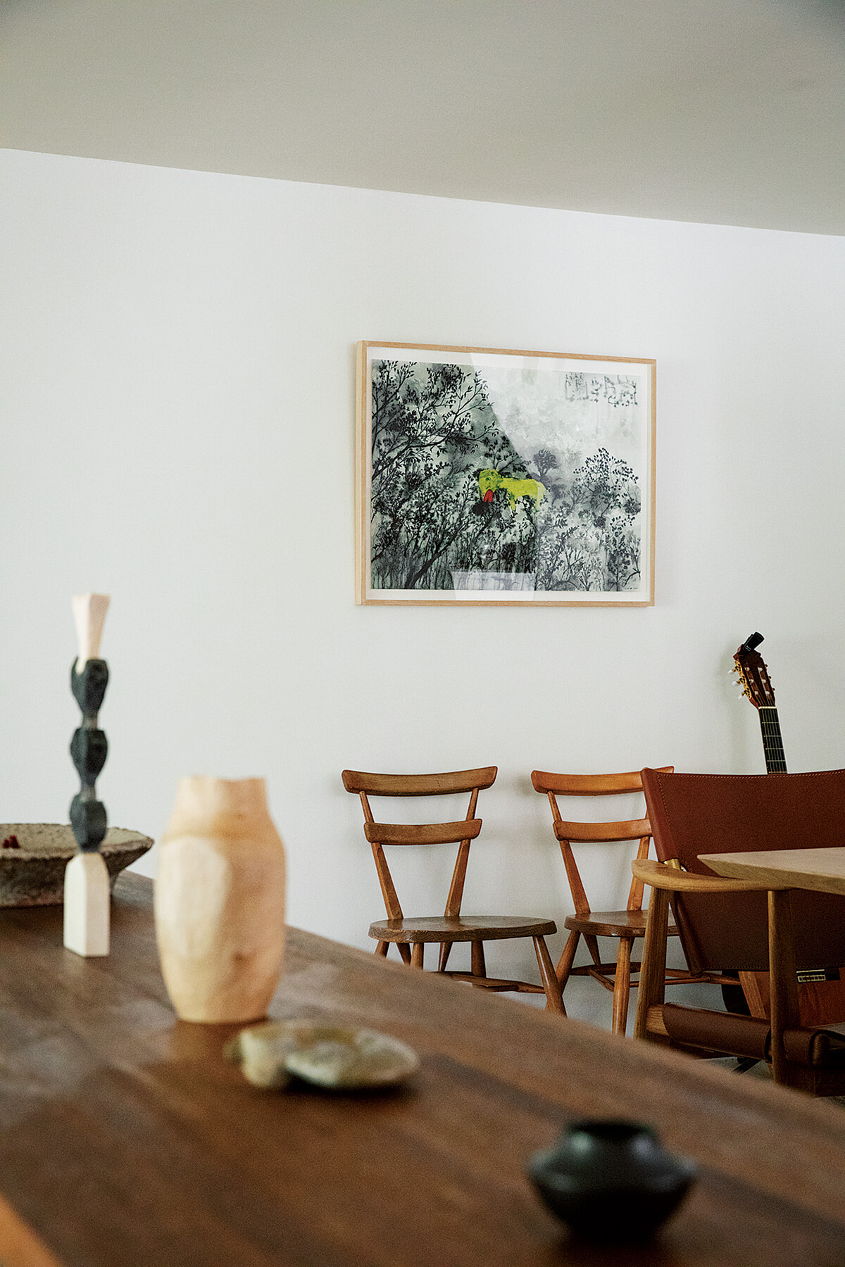 ダイニングにある、猫を抱いた人物の肖像画など個性的で可愛らしい絵画も目を引くが、鑑賞するだけでなく実際に使いながら楽しむ作品も多く所有している。たとえば、盛長省治。ウッドターニングという技法で、丸太から削り出すスツールや彫刻、うつわなどが注目されている木工作家だ。