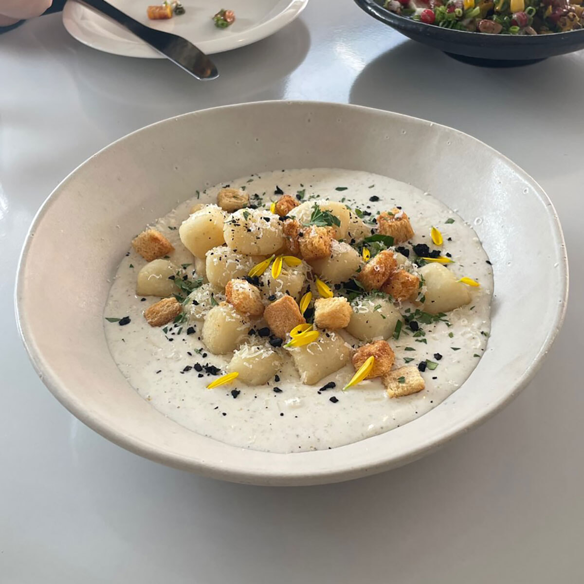 トリュフとクリームのニョッキは、とてもクリーミー。もちもちのニョッキとクルトンのコンビネーションがおもしろい。