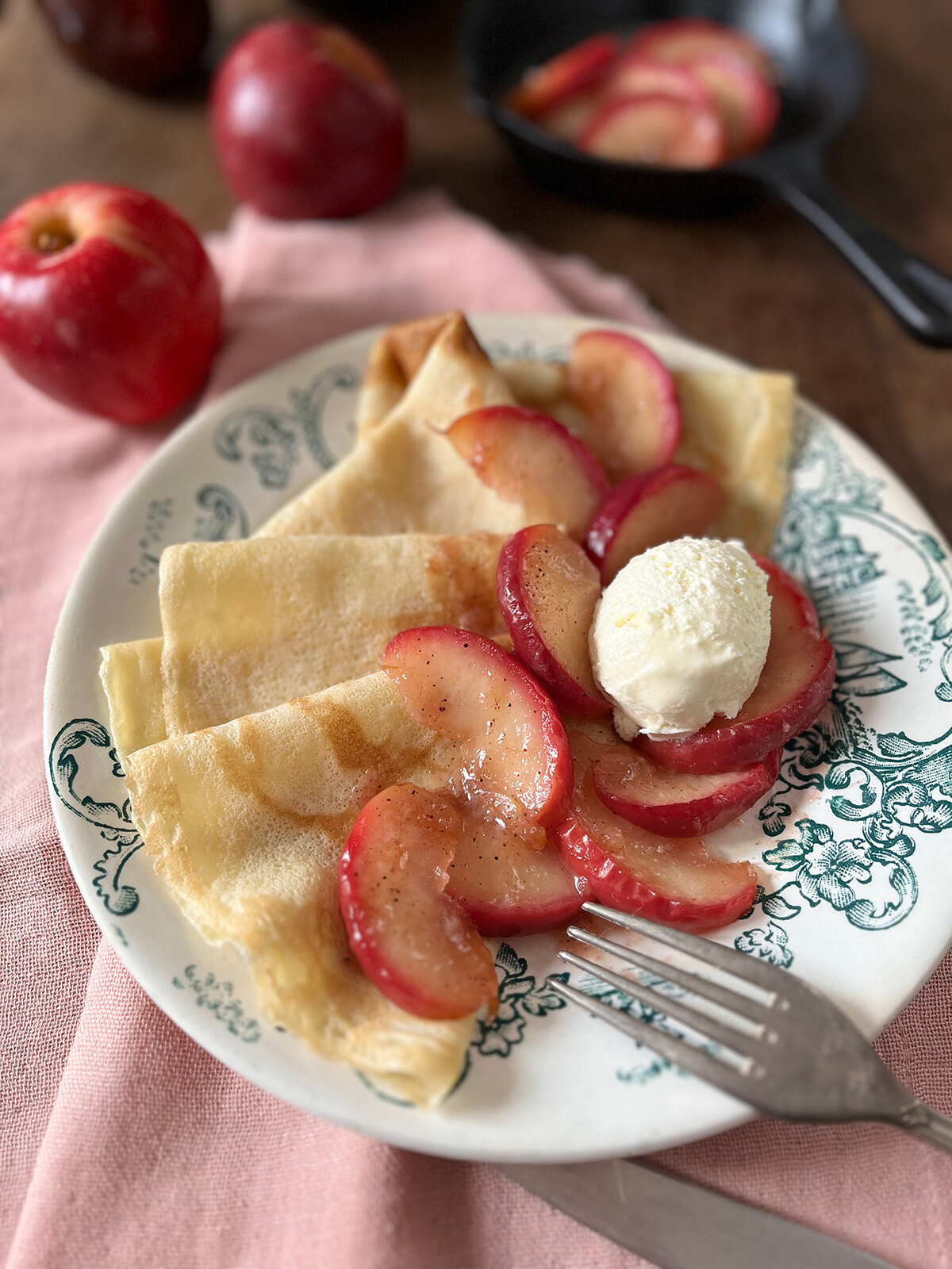 焼き上がったクレープを2枚ずつ折りたたんで皿に、その上にリンゴを並べる。好みでアイスクリームをのせると更にリッチ!