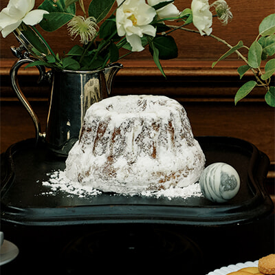 バターの名門が新たに手がけたのは、ブリオッシュ生地にレーズンを潜ませたシンプルな郷土菓子。焼き上がりに染み込ませたバターが香り豊か。たっぷりかかった粉糖もインパクトがある。ビッグサイズなのでホームパーティでも活躍しそう。