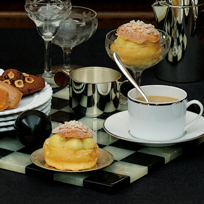 プラチナ縁のティーカップ&ソーサー「アルビ プラチナ ティーカップ&ソーサー」1セット¥15,400、ティースプーン「ムード コーヒースプーン」各¥8,800、三つ編み模様の縁のポーセレンのデザートプレート「バビロン デザートプレート」各¥20,900、クリスチャン・フェデルスタットによる銀製のコーヒーポットセット「フェデルスタット コーヒーポット」3点セット¥649,000/以上クリストフル 青山本店 アンティークの足付き台¥49,500、花を生けたアンティークのシルバーのティーポット¥23,100、お菓子を置いた白い大理石製台座¥19,800、アンティークグラス(左)¥5,500/以上フィネスタルト その他スタイリスト私物