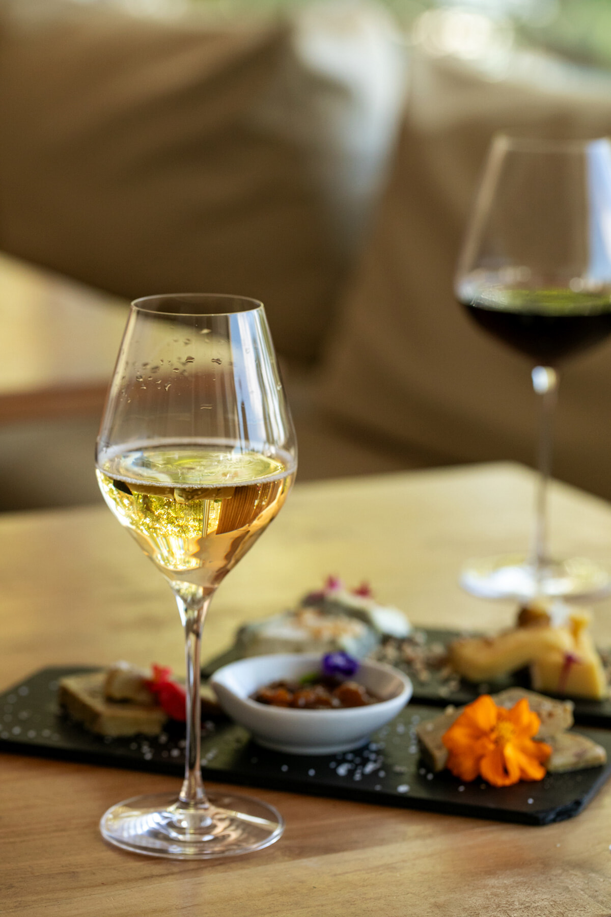 2週ごとに替わる本日のシャンパンは通常よりお得に提供。この日は「Bollinger Special Cuvée Brut」グラス2,500CFP。赤は「Domaine de Fa, Beaujolais 2020」グラス1,200CFP。手前はフォアグラのミキュイ「Foie Gras de Canard Mi Cuit Nature」3,500CFP、奥はトム・ド・シャンブリルの山羊チーズ、トリュフ風味のペコリーノ、セミハードのサン・ネクテールを盛り合わせた「Assiette 3 Fromages」2,200CFP