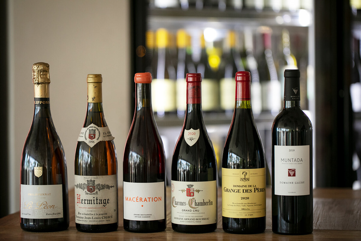 左から、ピノ・ノワール100%のシャンパン「Philipponnat Le Léon 2006」29,000CFP、ローヌ地方、ジャン=ルイ・シャーヴの白ワイン「Hermitage 1996」69,500CFP、ピノ・グリのオレンジワイン(見た目はほぼ赤)の「Macération」8,000CFP、アルマン・ルソーの赤「Charmes Chambertin 2020」59,000CFP、ラングドックのカルトワイン、ローラン・ヴァイエが最後に手がけた赤「Grange des Péres 2020」20,000CFP、南仏のナチュラルワイン、ドメーヌ・ゴビー「Muntada Rouge 2019」19,000CFP