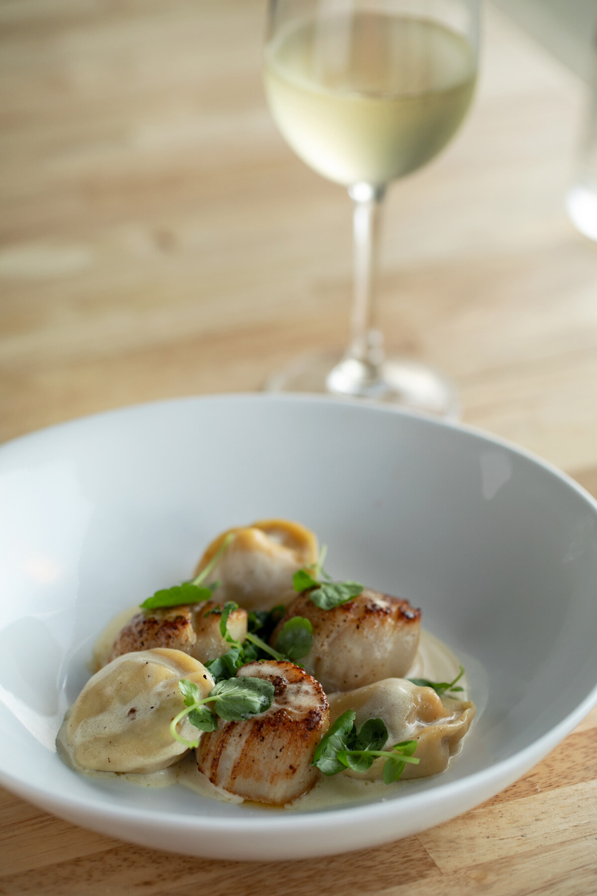 3品目、ローストしたホタテ貝とリーキのラビオリ「Coquilles Saint Jacques Rôties, Ravioles de Poireaux, Crème Suprême au Vin Jaune」。白ワインはボトルで5,410CFP~