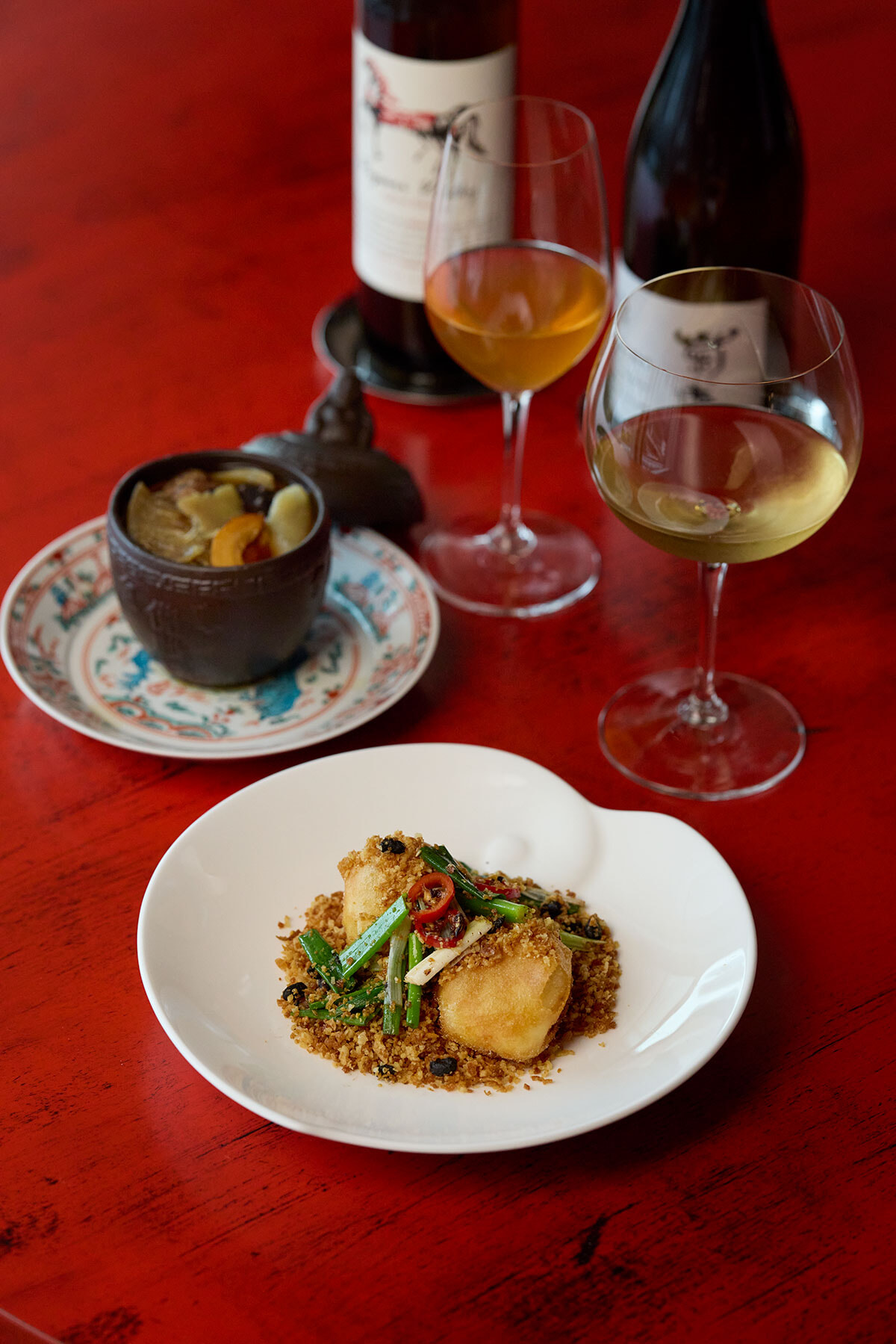手前から「国産生ホタテ 香港漁港風フライドガーリック炒め」¥5,600、「菊鹿ワイナリー/シャルドネ 熊本 2021」グラス¥2,600、「~フォティア オチャン~(壷蒸しスープ)」¥16,800、「パパリ・ヴァレー/スリー・クヴェヴリ・テラスズ ルカツィテリ No.3」グラス¥3,400