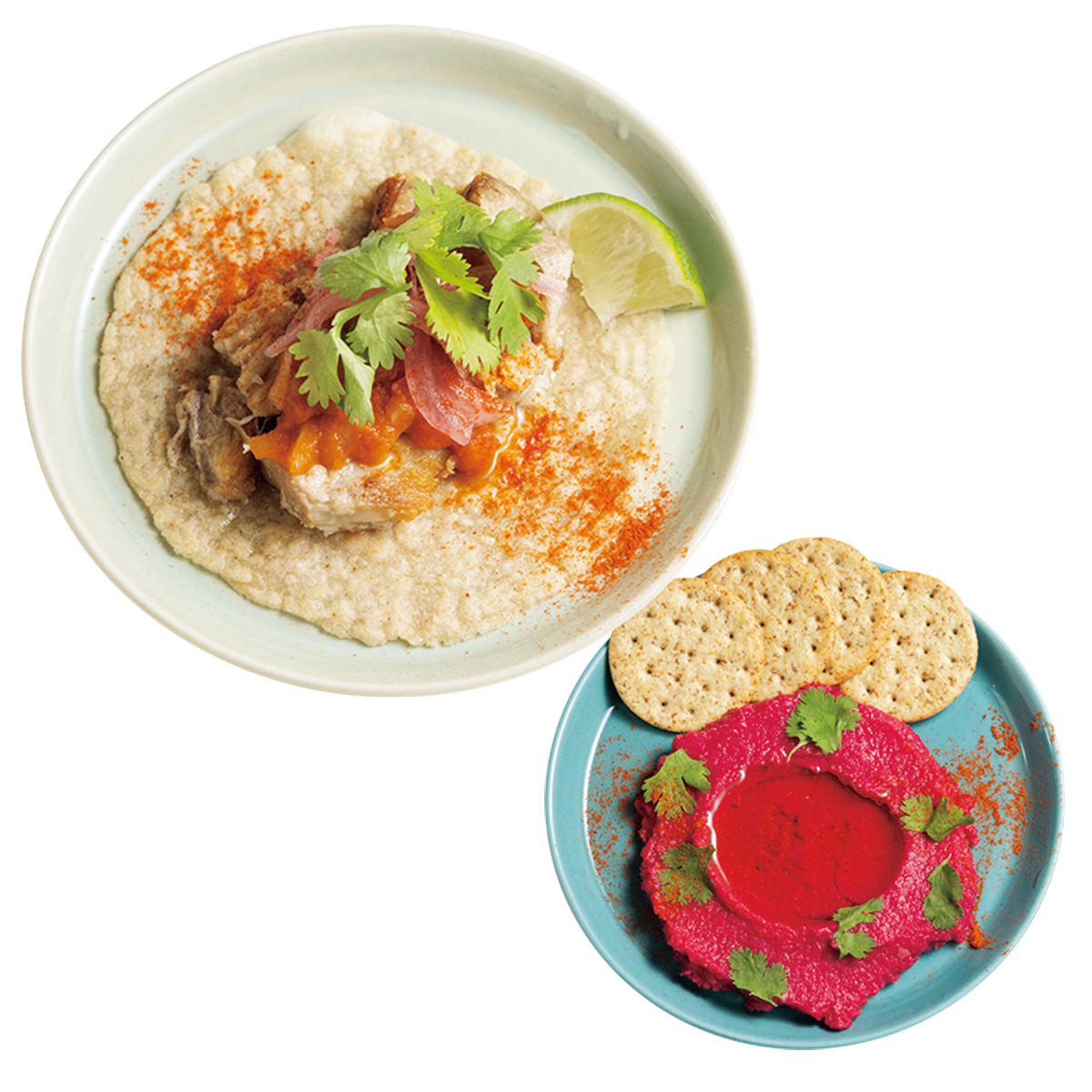 左上:メキシカンタコスの定番「カニータス(豚)」¥550 右下:「ビーツのフムス」¥380。ひとり飲みにうれしい小ポーションのメニューが揃う。