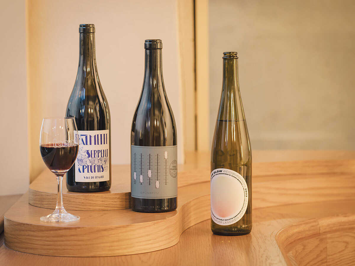 トレンドをおさえた約40種類のナチュラルワインをラインナップ。左から、フランスの赤「ドメーヌ・ラ・カルメット/セルパン・ア・プリュム 2021」グラス¥1,200、ルーマニアの白「エドガー・ブルトラー/グリュンシュピッツ 2022」グラス ¥1,300、ドイツの白「グロウ・グロウ/ヴァイスブルグンダー 2023」グラス¥1,100