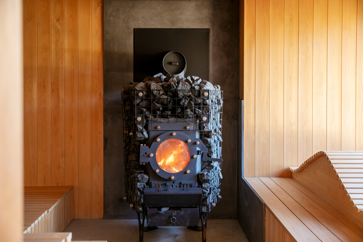 向かって右が薪サウナ、左は日本の古代サウナ、石風呂を再現。貸し切り利用も可能。