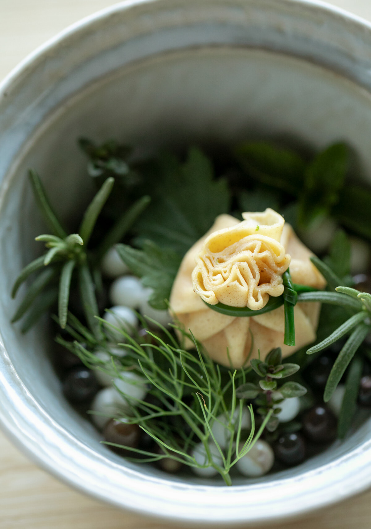 シグニチャーの「嘉蔵のお財布」は、巾着の中からウニクリームと真珠貝のスモークが!