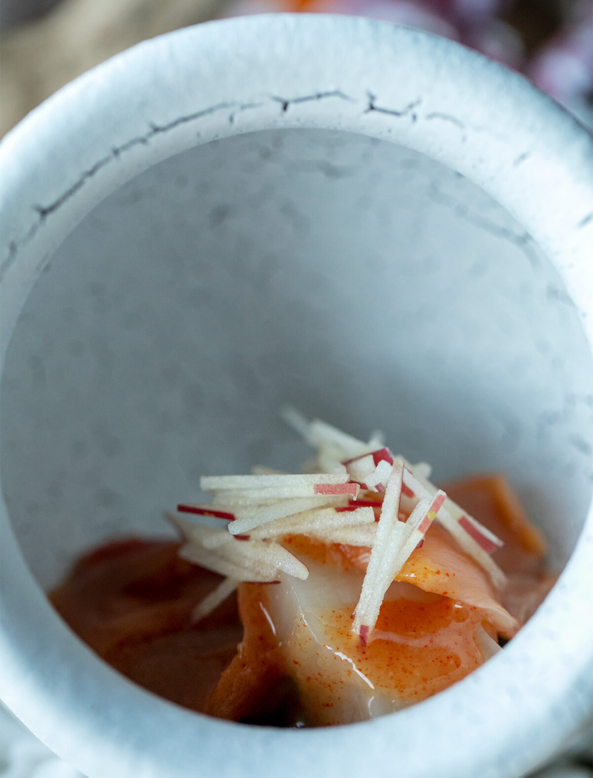 冬が旬のヒオウギ貝と赤貝を酢味噌で和えた「カラフルシェル」