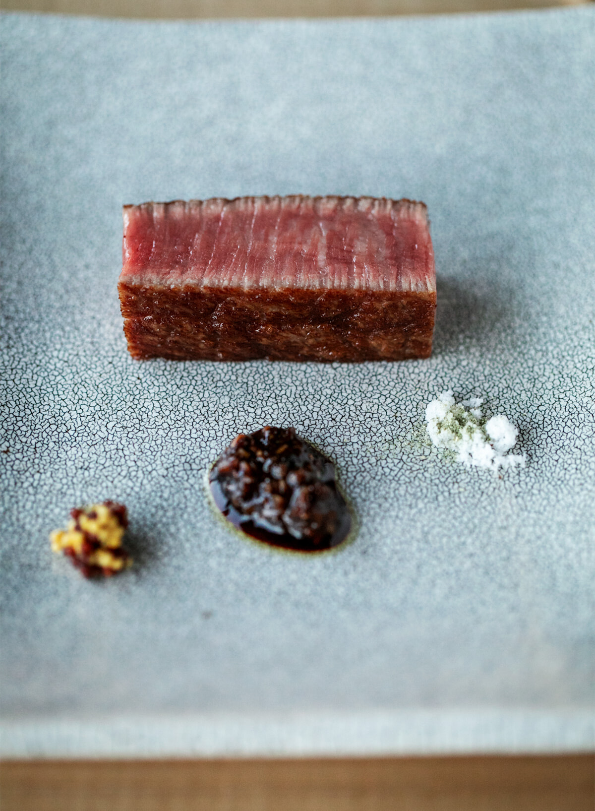 「松坂牛のいいとこ」、つまりシャトーブリアンを備長炭で炭火焼きに。マスタード、黒ニンニク発酵ソース、神島の塩と実山椒でいただく。新鮮な食材尽くしのディナーは全11品。