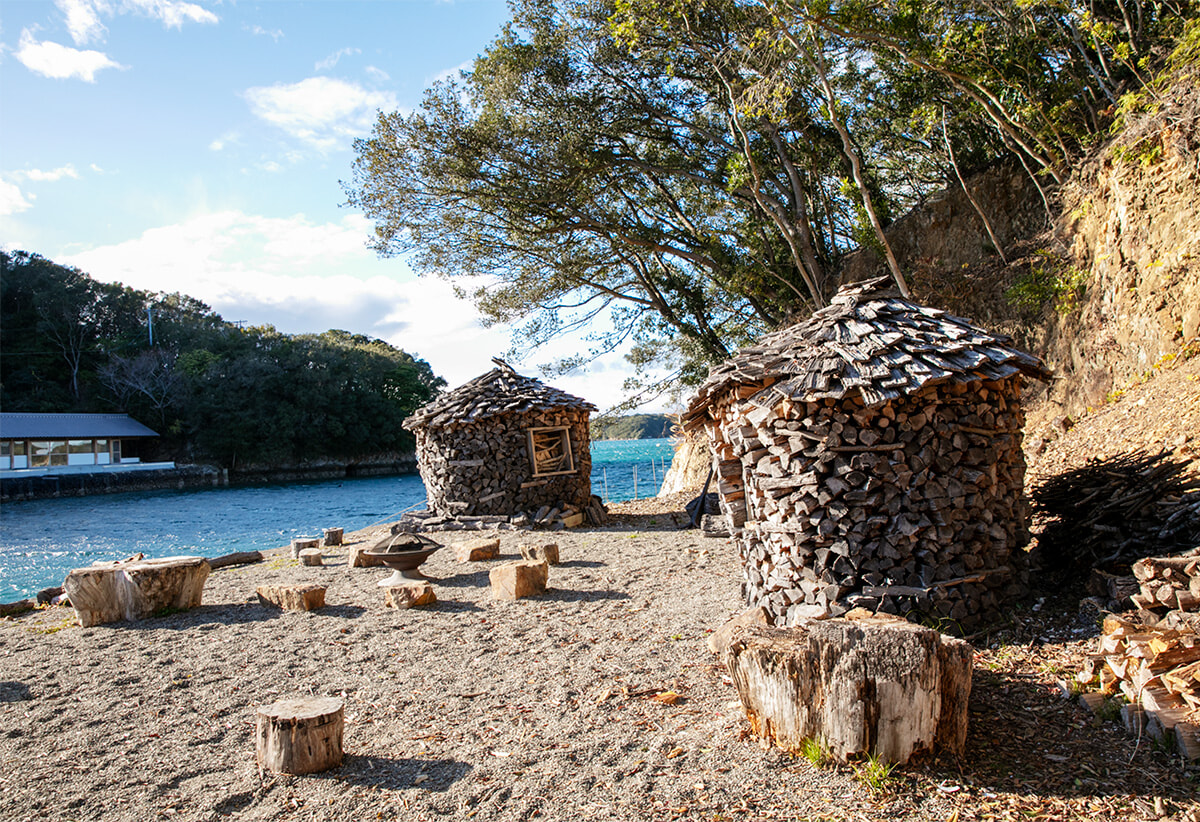 まずは、海が目の前のパブリックサウナへ。珍しいのは、身を清める意味を持つ日本古来のサウナを再現した石風呂があること。薄暗い中、寝転んでじんわり身体を蒸されるのは、まるで瞑想のよう。薪サウナで汗をかいたら、水風呂代わりに海へドボン。理想の”ととのい”が待っている! 一方で、その熱源である薪割りも体験できる。周囲の里山が豊かであるために間伐した木材を利用しているのだ。