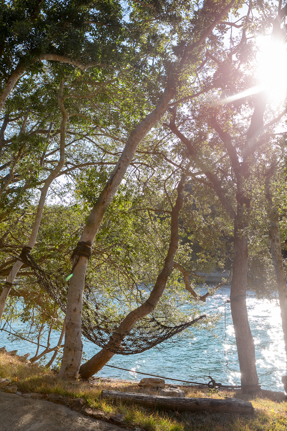 漁網をハンモックにアップサイクル。木々の間にひっそり吊られている。