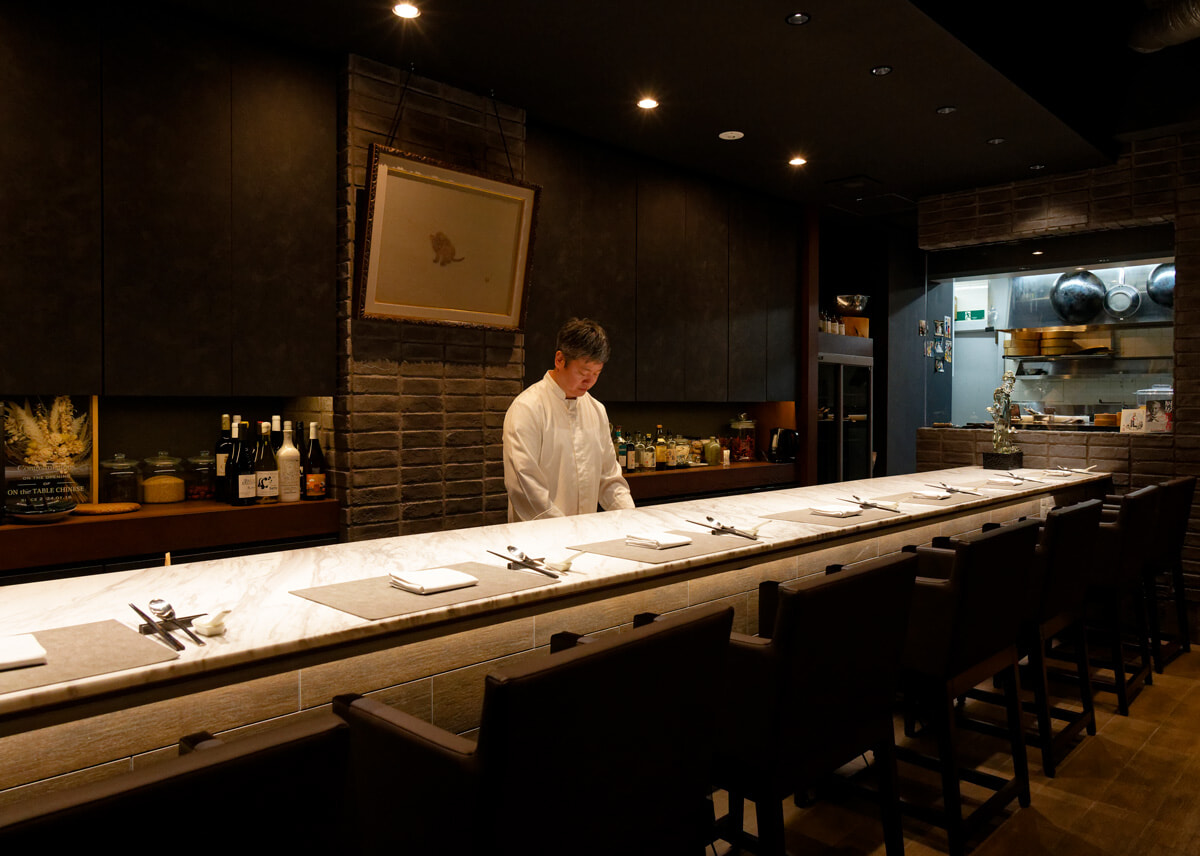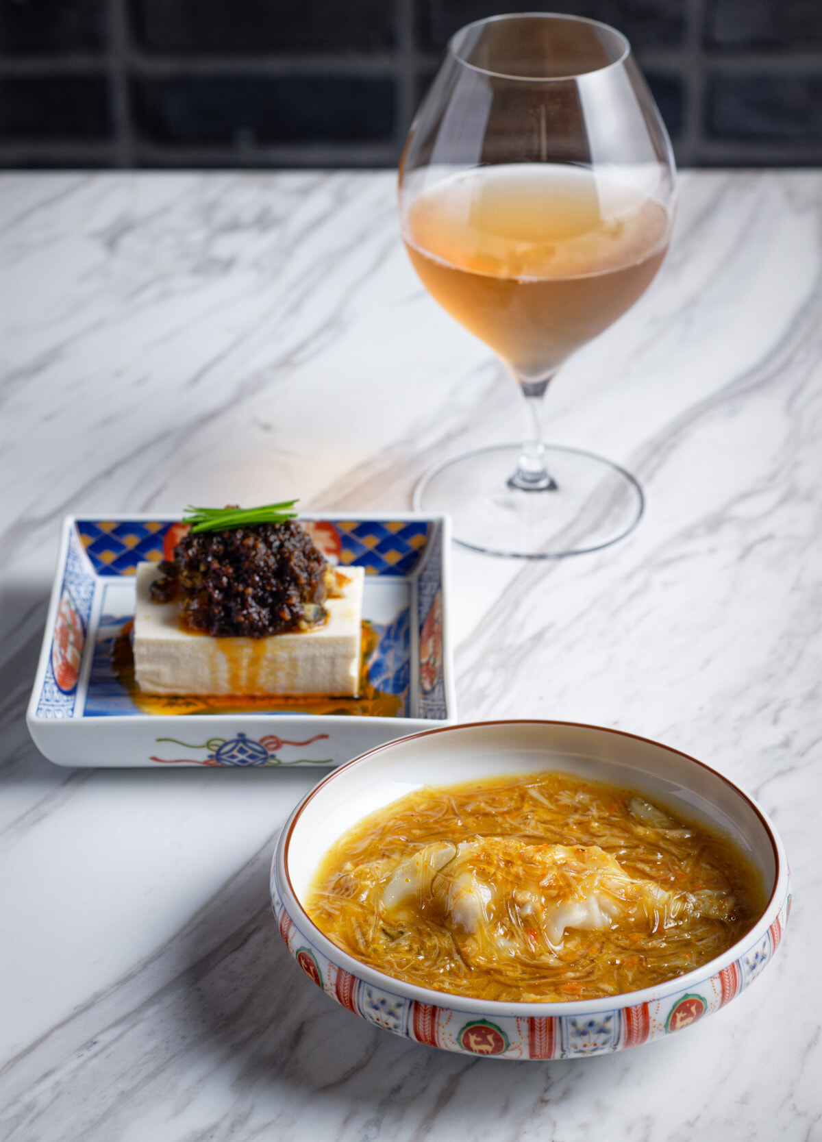 中国料理界の匠、脇屋友詞シェフのもとで働き、技と知識を身に付けたシェフが独立。ホテルのバーのようなラグジュアリー空間では、コースとともにペアリングを楽しむ常連が多い。ワイン4杯6,600円から、2時間半の時間内であればコース料金プラス15,000円で杯数無制限というシステムも。日本や北欧のレア銘柄も揃えており、ボトルとアラカルトのオーダーも可能とくれば、その自由度に心が弾む。