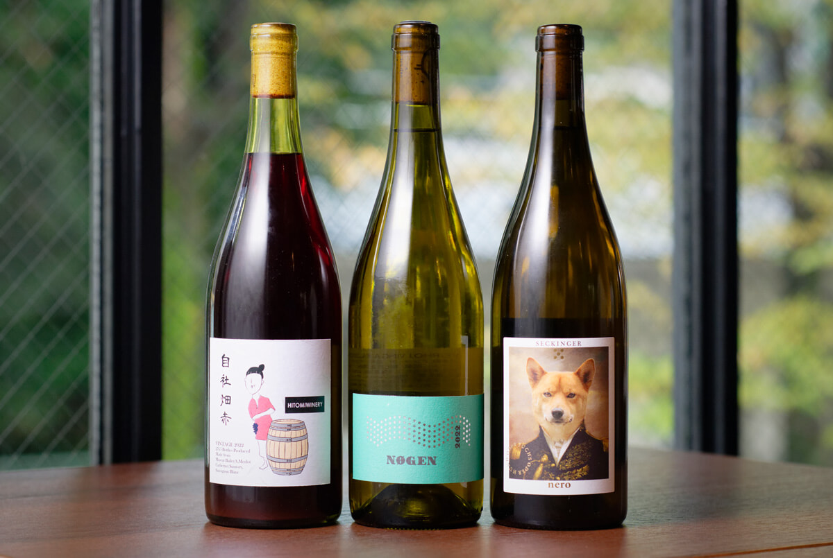左から、滋賀の「ヒトミワイナリー/自社畑赤 2022」ボトル¥9,400、デンマークの「ヴェアホイ・ヴァンゴー/ノーゲン2022」ボトル¥14,000、ドイツの「ヴァイングート・ゼッキンガー/ネロ・ビアンコ 2022」ボトル¥7,700