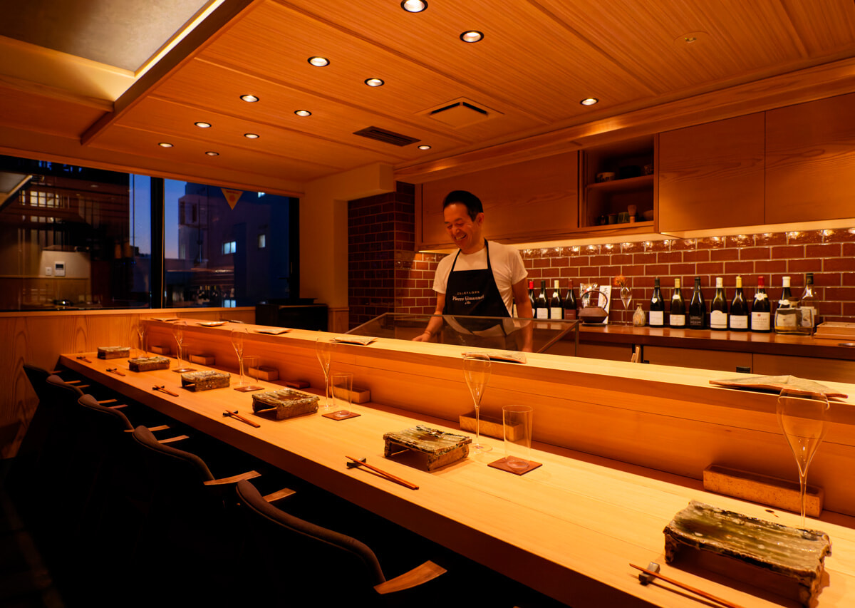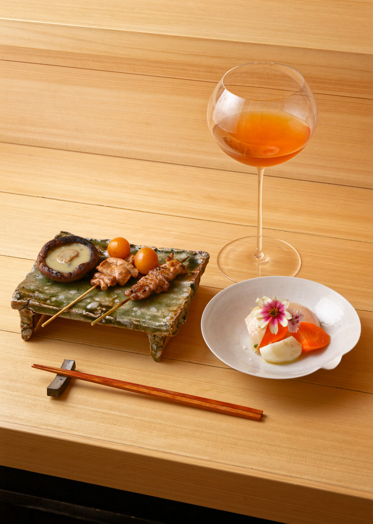 ソムリエとしてキャリアをスタートさせた店主が、独立に際して焼き鳥の有名店で修業。炭の薫香には「ピノ・ノワールが抜群に合う」と断言するだけあって、300種揃えるワインの中に重厚感のある赤ワインの扱いはなしという徹底ぶり。ワインに合うように工夫を凝らした串は、せせりの旨味にハリッサのスパイシーさを加えるなど創意が光る。3杯から提供するペアリングの楽しさにも心が浮き立つ。