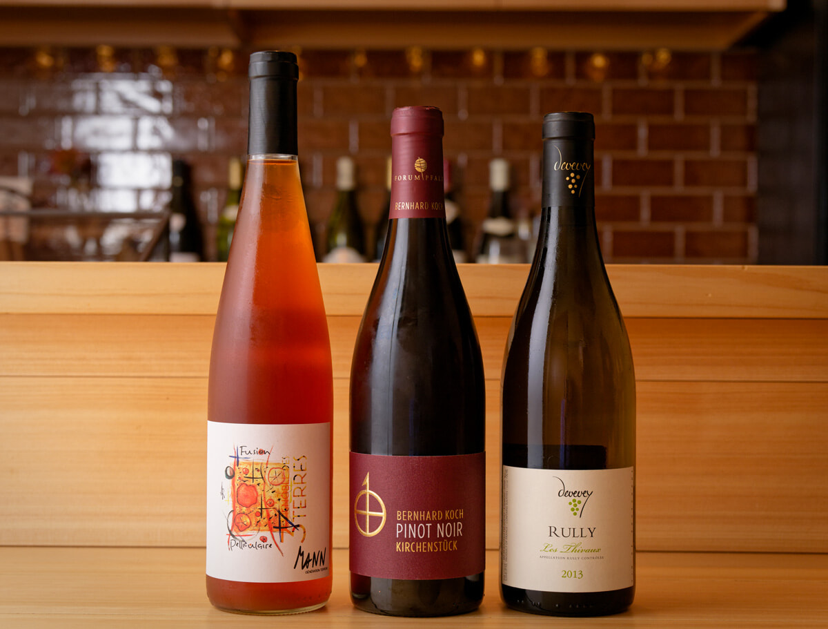 左から、「セバスチャン・マン/フュジオン ペリキュレール 2022」ボトル¥14,800、日本人の女性醸造家による「ベルンハルト・コッホ/キルヒェンシュトゥック 2021」ボトル¥15,800、「ジャン・イヴ・ドゥヴヴェイ/リュリー レ・チヴォー 2013」ボトル¥9,800