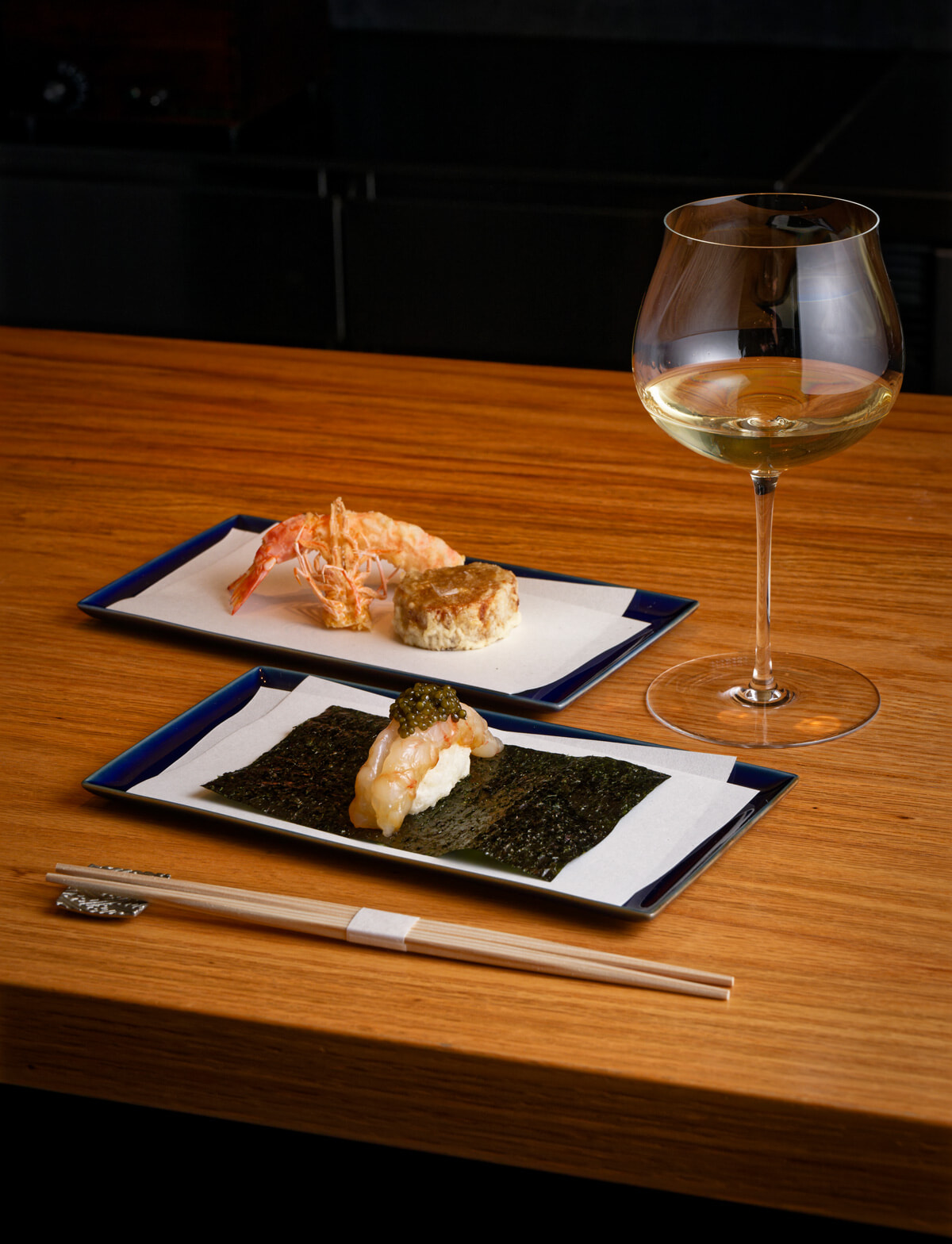 手前は、しゃりを揚げて上に生のエビとキャビアをのせた変わり種「しゃり天 漬けボタンエビ」¥4,200。奥は¥20,000のコースより、「活けクルマエビ」「極みの焼きイモ」