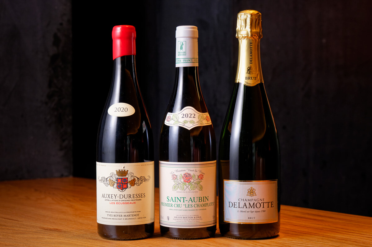 左から「イヴ・ボワイエ・マルトノ/オーセイ・デュレス・ルージュ 2020」ボトル¥18,000、「ジル・ブートン/サン・トーバン プルミエ・クリュレ・シャンプロ・ブラン 2022」ボトル¥23,000、「ドゥラモット/ブリュット」ボトル¥13,200