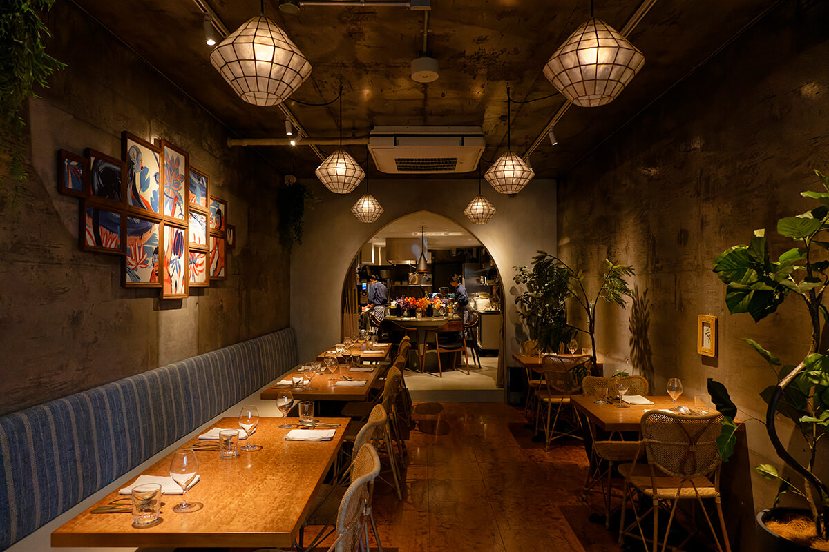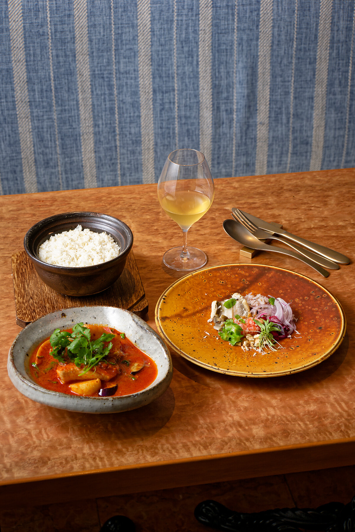 タイの伝統料理を主軸に、魚を中心とした日本の食材とフレンチの技法を融合させた一軒家レストラン。感性豊かな若きシェフが紡ぐのは目に美しく、身体に優しい料理の数々。辛さを立たせるよりも発酵野菜で旨味を底上げしたり、ワインと楽しめるようにフルーツビネガーなどを使うことも。柔軟な発想から生まる料理にはソムリエが厳選した「いろいろな国を旅するように楽しめる」ペアリングを。