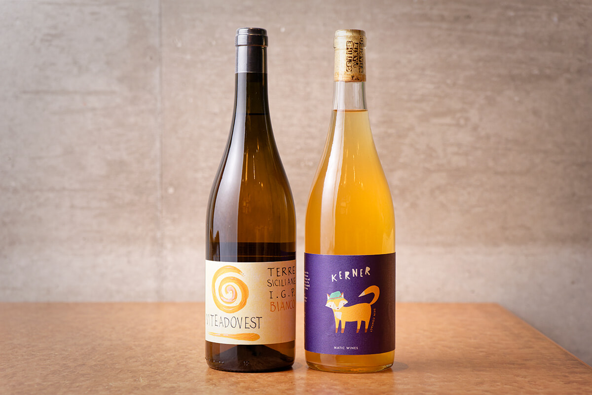 ワインはともに¥6,500のペアリングの一例。左から、シチリアの「ヴィテアドヴェスト/ビアンコ 2021」、スロベニアの「マティッチ/ケルナー 2023」