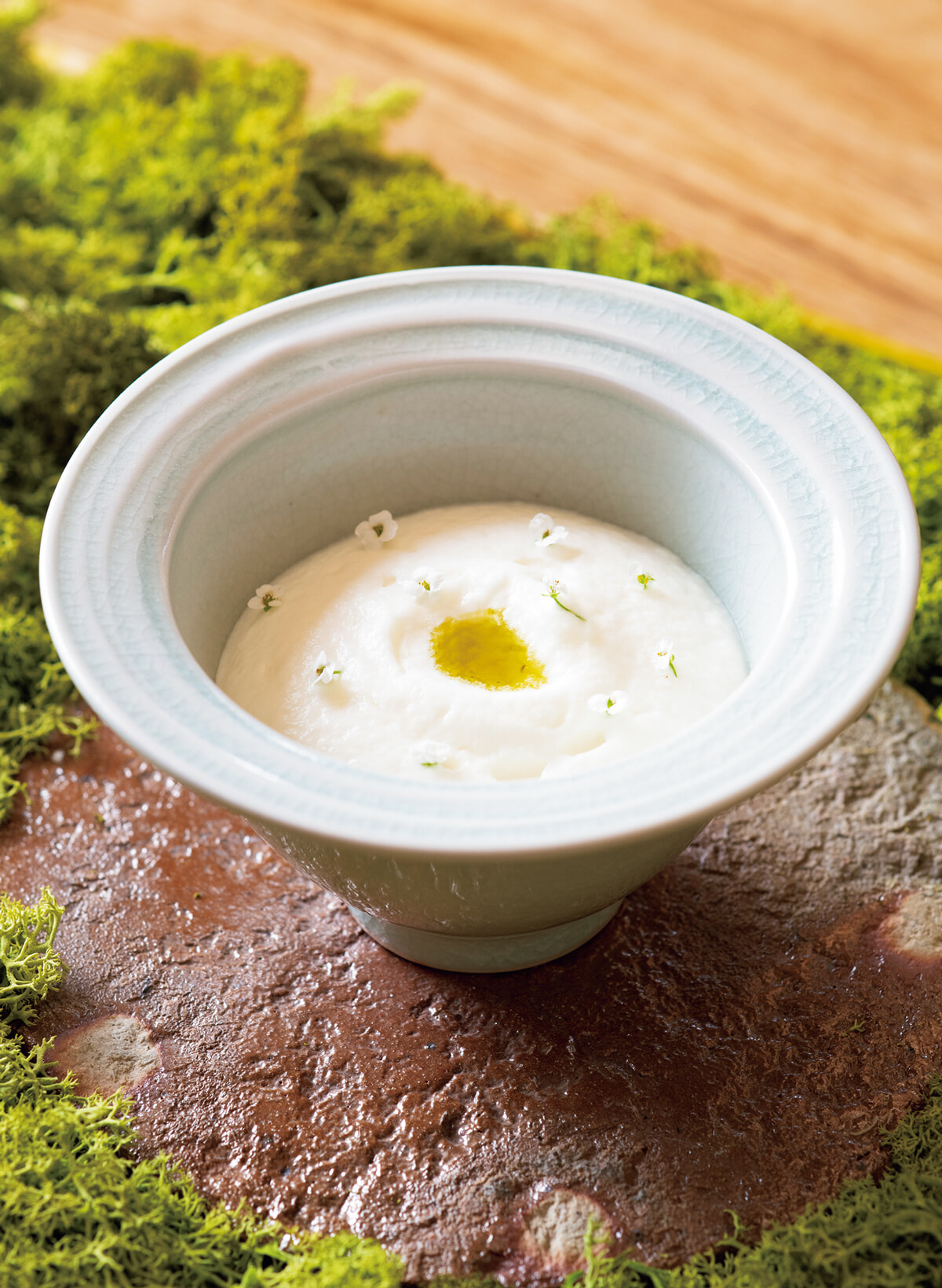 カブの冷製ムースは中央にカブの葉を漬けたオイルを載せて。野菜の滋味が宿り、甘さを感じるくらい。