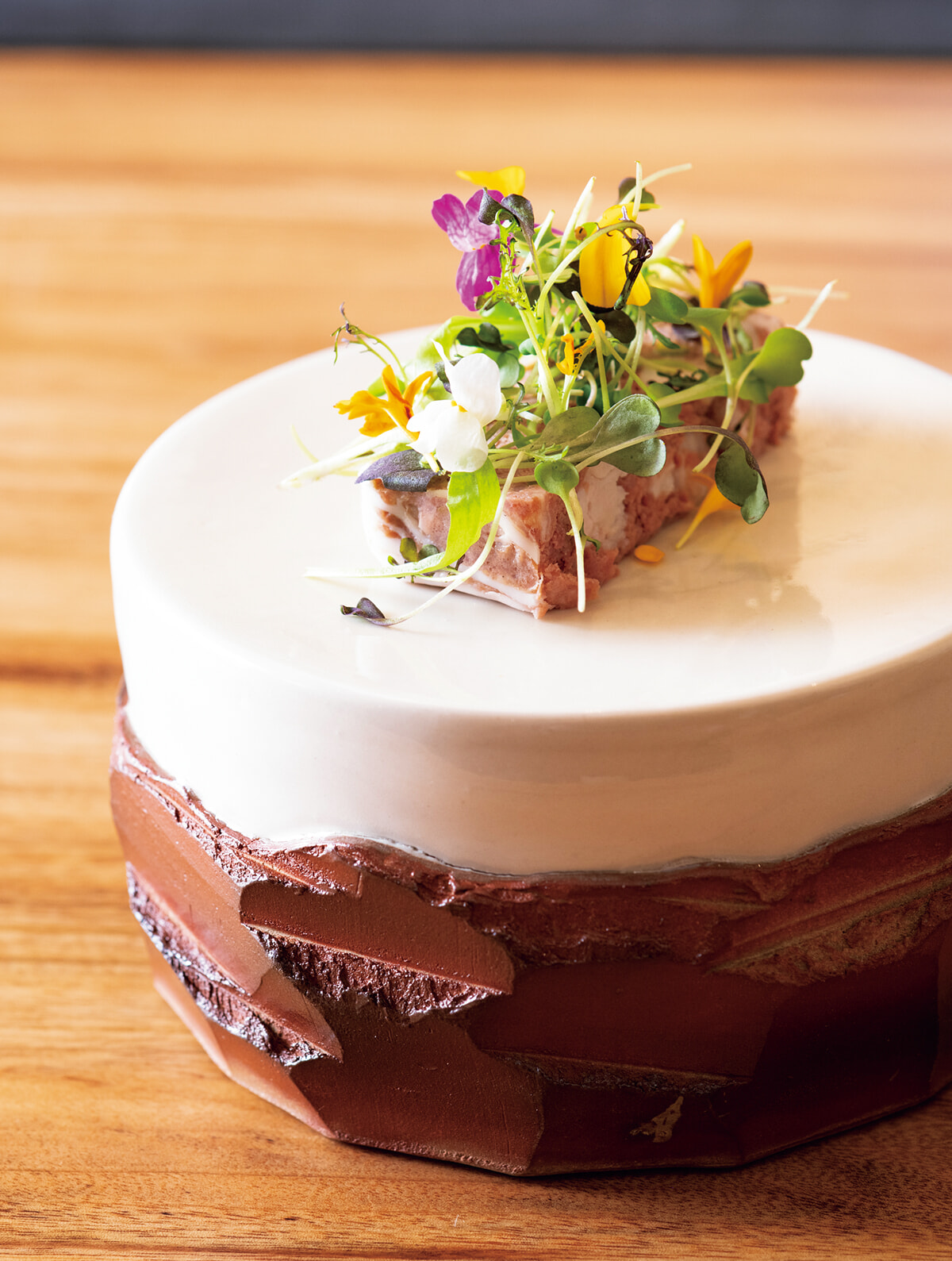 天城軍鶏と黒豚、レバーで仕上げたパテドカンパーニュ。「畑を表現した」というひと品には上にエディブルフラワーが散る。肉の旨味が凝縮された洗練の味わい。うつわは料理に合わせてサイズや焼き方にもこだわり、敬愛する作家にオーダーメイドでお願いしている。