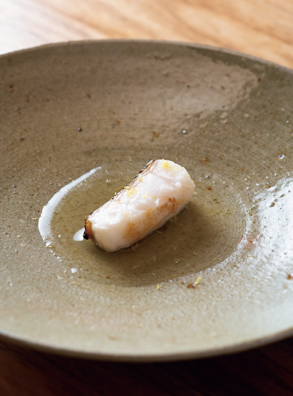鯛の出汁のスープに載せたクエのグリル。柔らかく調理され、皮の焼き具合が香ばしい。
