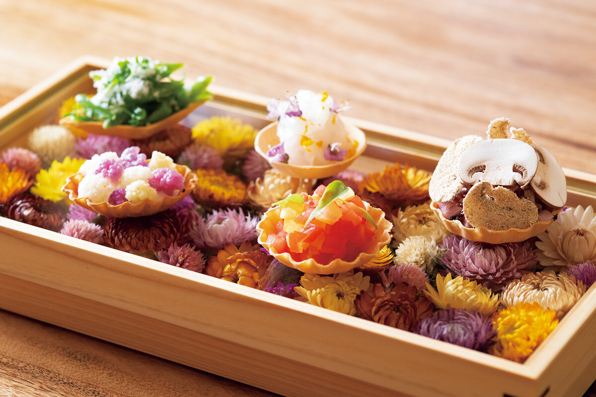 ディナーの最初に供されるお茶の直後に出る、プティフール風アペタイザー。通常4~5種で、この日は伊豆高原のトマトやカリフラワーなど彩り美しく。
