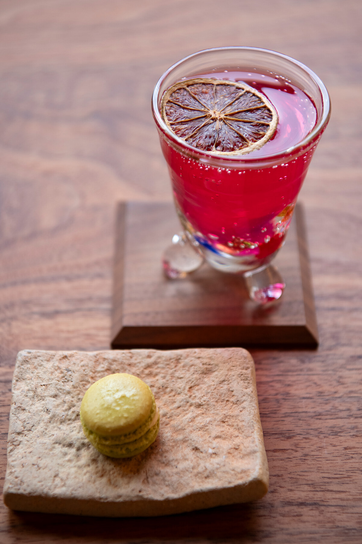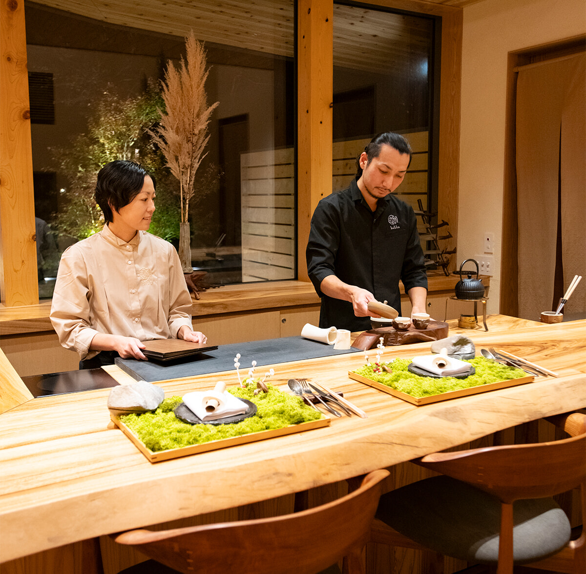 おいしい食事を目的にした滞在であっても、こぢんまりした棟に一日一組だけの長閑な滞在ができるのは魅力的。「優しい雰囲気にしたかった」という内装は、木と石が配された自然素材の空間。大きな窓から光が差し込み、静岡の柑橘類がさりげなく飾られている。プライベートな時間を楽しんでもらうため、多種のリカーを揃えソーダストリームを置き、地元のフルーツを味わえるようスロージューサーも完備。カクテルを自由に作る楽しみを提案している。スナックまで一部手作りのドライフードを備えるほど!