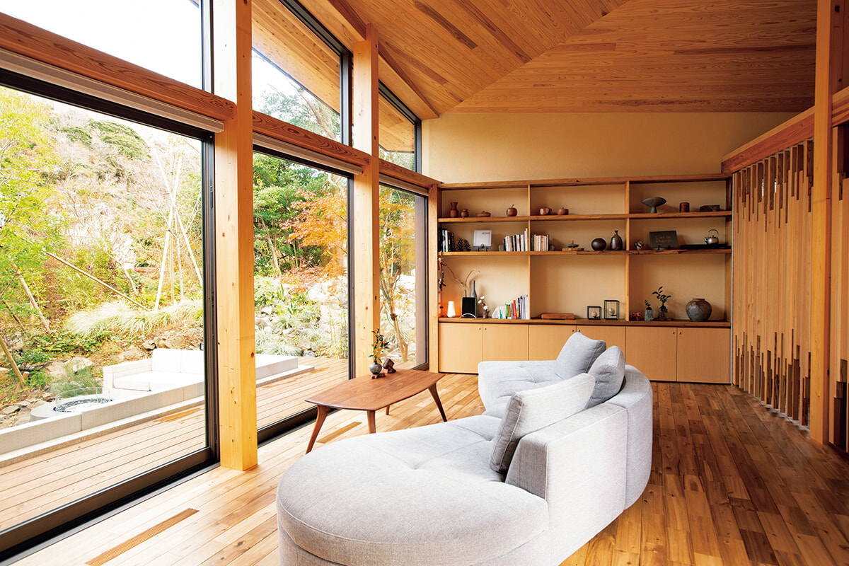 大室山を眺めながら寛げる1階のリビングルーム。さまざまな木を使用しているせいか、木目が静やかに空間を演出。ソファで寛ぐ際、野生のリスを見かけることも。