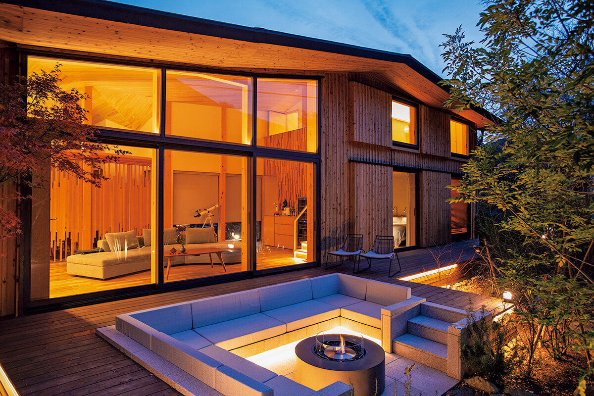 アウトドアリビングと呼んでいる裏庭では最新装備の焚き火も楽しめる。デッキにヨガマットを敷いて、朝ヨガする女子会も楽しそう。