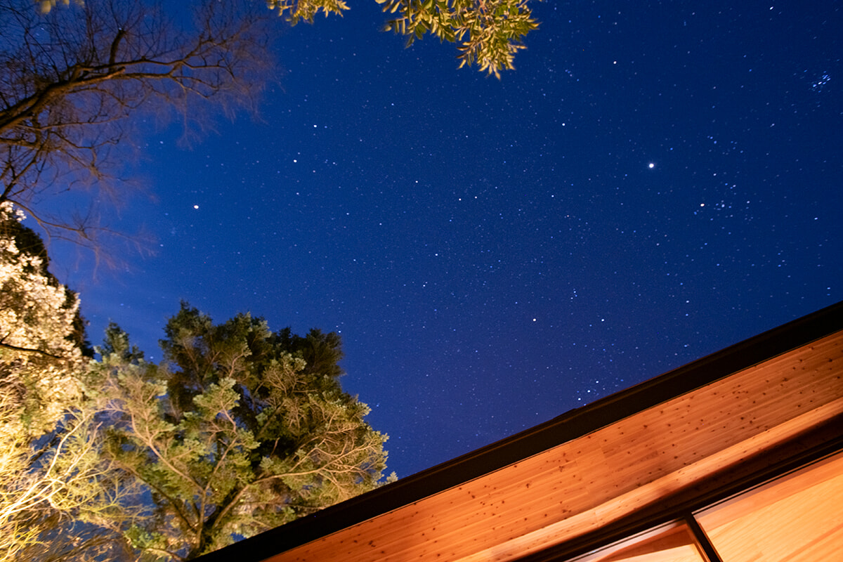 リビングルームに天体望遠鏡があり、伊豆高原から見上げる夜空の星が見られる。