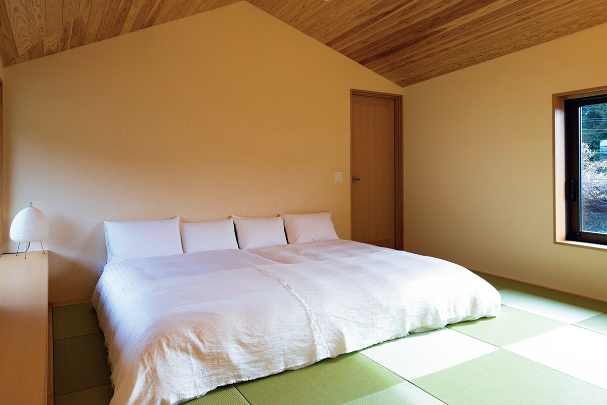 施設内に寝室はふたつ。写真は2階の琉球畳の和室。部屋着やスローケットなどもオリジナルで、糸を厳選し、織り方のリクエストもして作ったもの。