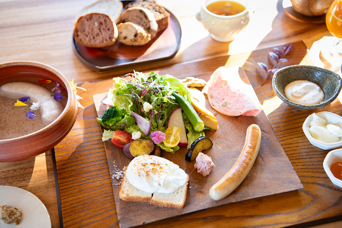 朝食は2タイプから選べる。畑で採れた新鮮な野菜を用いたサラダが美味。ドイツ風の洋食。シャルキュトリー類や、多種のパンにつけるバター、ジャム、ソースなど飽きさせない工夫がたくさん。