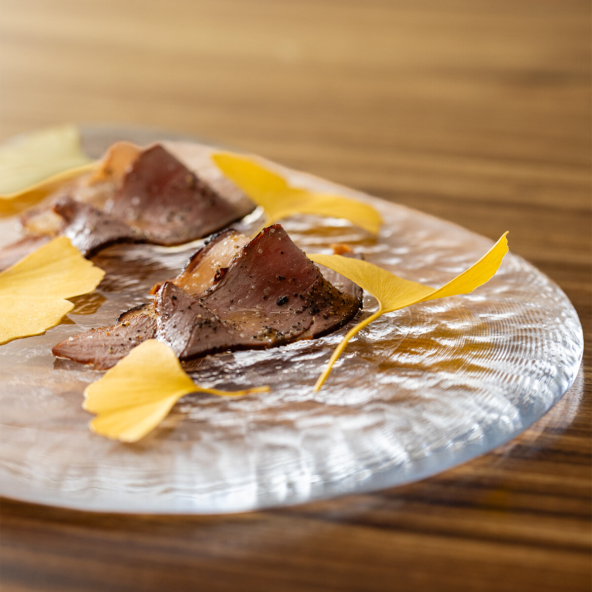 トマト麹に猪肉を1日漬け込んだハムは仕上げに黒胡椒。名前の由来である水をイメージしたうつわはシスイ作。