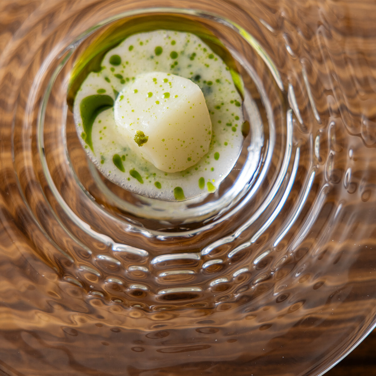 シェフを筆頭にスタッフは20代や30代が多く、エネルギッシュ。ディナーのサーブをするスタッフは、コース途中に提供される栗の鬼皮の酵母を使用したパンの酵母作りを担当。採集から携わるからこそ、自然と料理の説明にも熱が入る。白山の湧水と山、海に恵まれたここは天然の食の宝庫。「野菜は淡くて力強く、余韻がある」と話す糸井シェフの作る料理はフレンチをベースに、季節ごとにゆるやかに変わるおまかせコース12品。軽やかで楽しい仕掛けに満ちた、わざわざ食べに行くべき一皿が待っている。