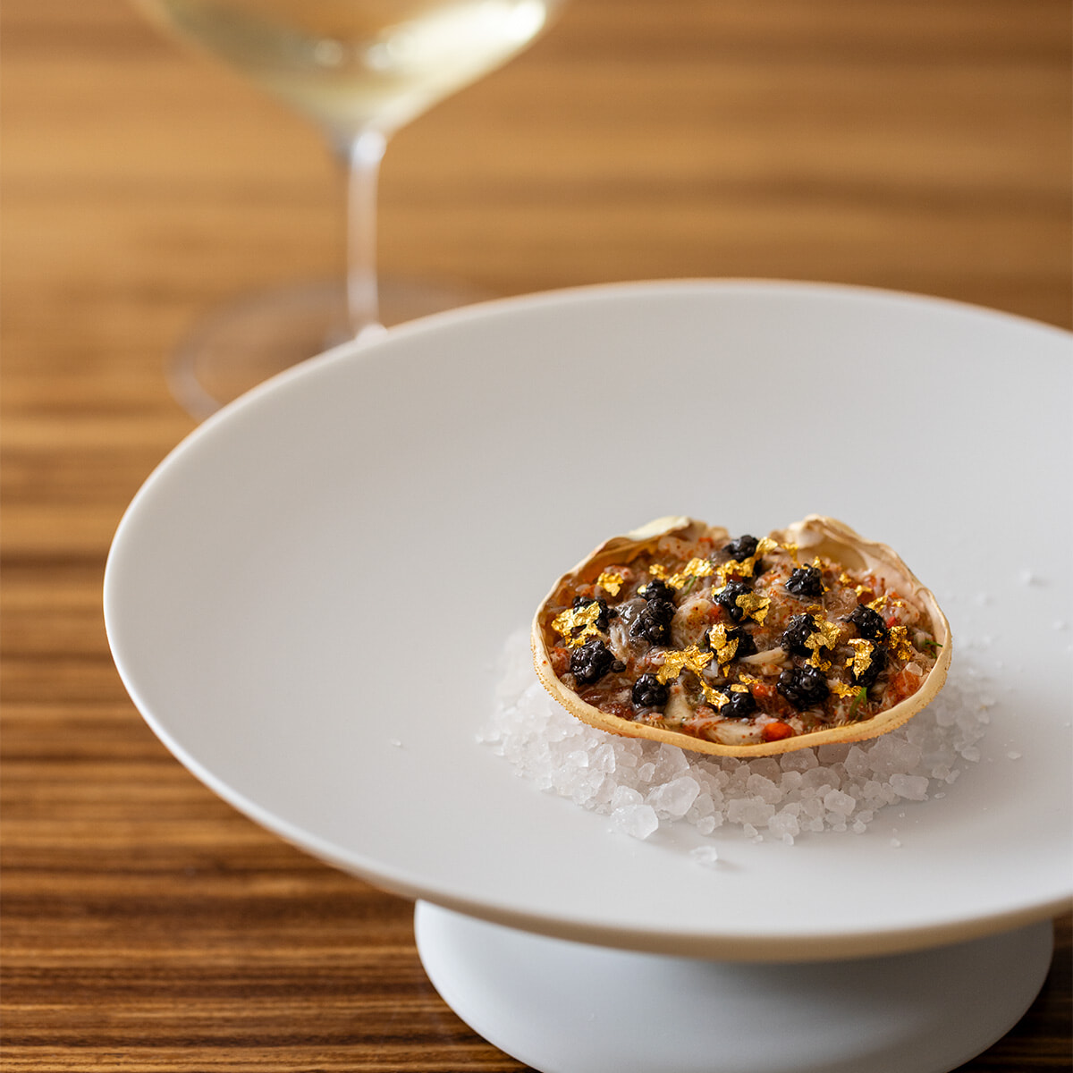 香箱蟹はキクイモムースの上でプチプチ食感やトマトのジュレが爽やか。ワインペアリングは6杯¥11,000~